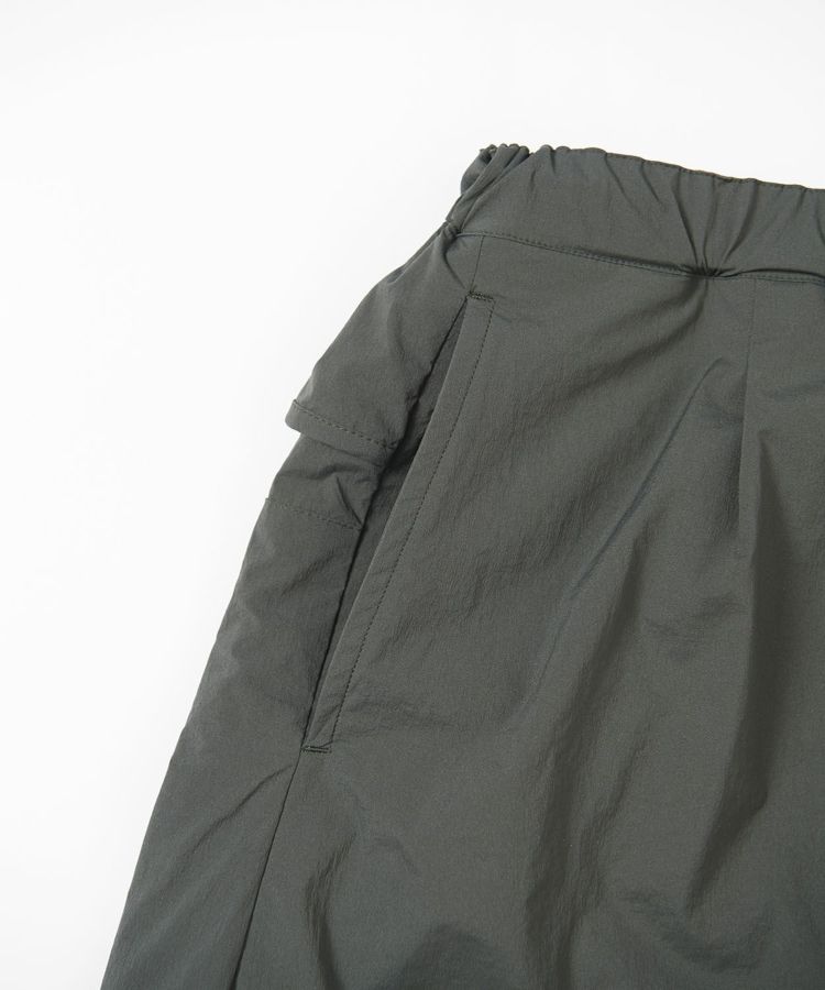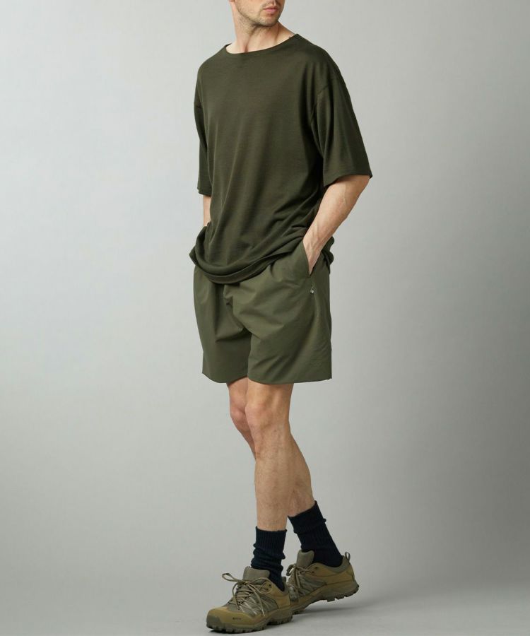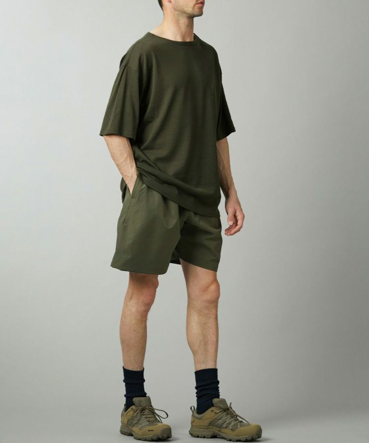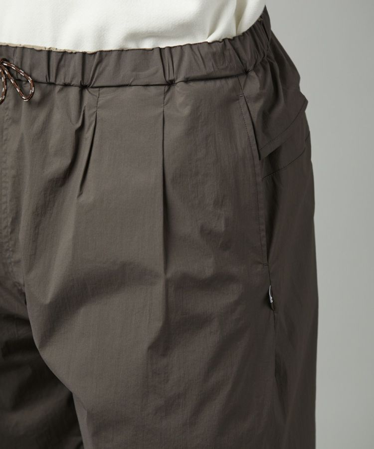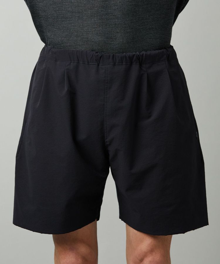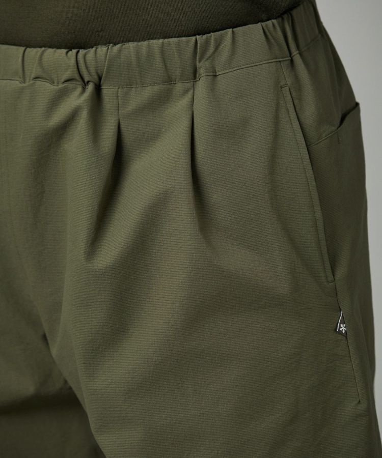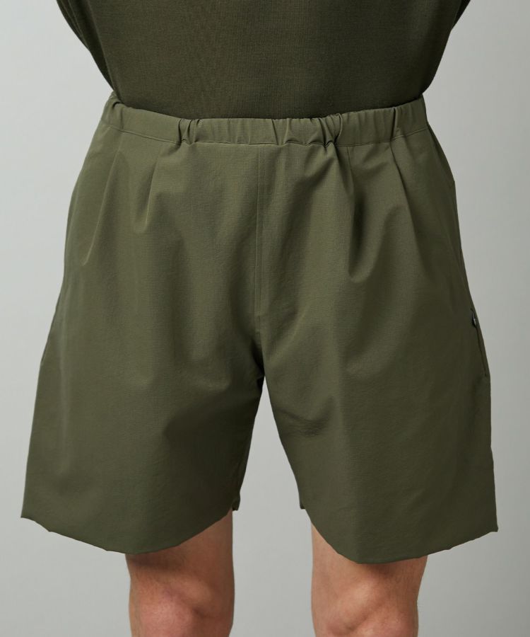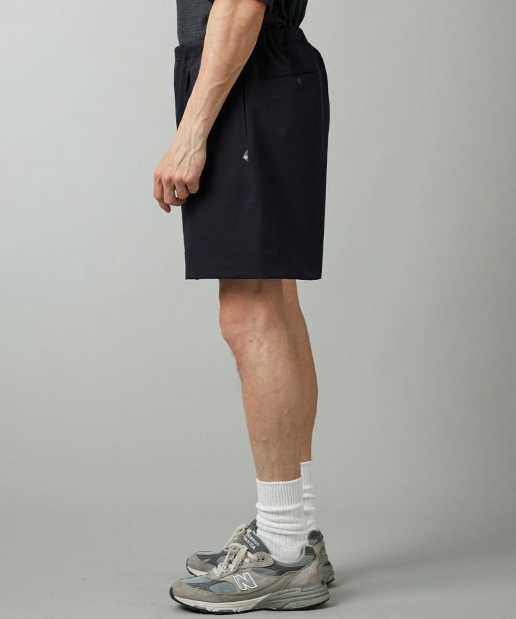片面にナイロン素材の「クリスピーナイロン」、もう片面にはポリエステル素材の「クールドッツ」をセレクト。クリスピーナイロンはナイロン素材であるにも関わらず、ストレッチ性と強撥水性を持っている素材です。細番手の20デニールナイロンを使用しているため、軽量で動きやすさもある高機能素材。クールドッツは経糸と緯糸の交差するポイントに小さな通気孔のある素材。風通しが良くストレッチ性もあるので、涼しく動きやすい快適な着心地を楽しめます。