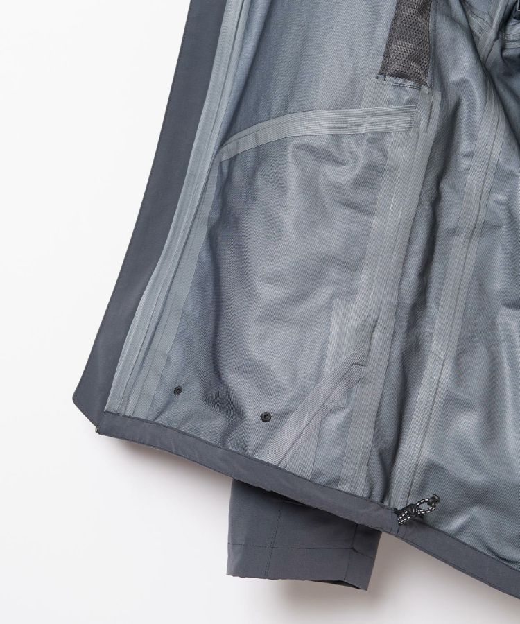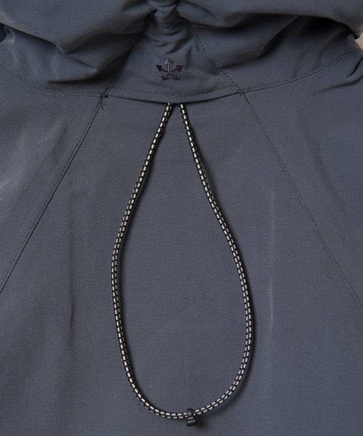 裾と背面のフード部分にはドローコードが付いており、突然の雨や冷たい風が吹くときなど、体を守りたいときにすぐに調整が可能。切替パーツのデザインはカレドアーのロゴをイメージし、細部にまでこだわりが詰まっています。ワードローブに一枚あると何かと重宝する万能ジャケットです。