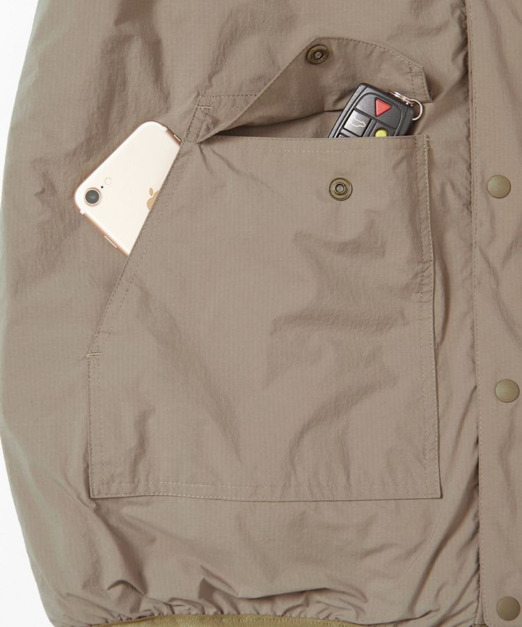表面の生地は、軽量で耐久性に優れたリサイクルナイロンリップストップ素材。裏面は太陽光の赤外線を効率よく活用し、蓄熱保温をする新素材「WarmdArt®」(ウォームダール)を使用。着用時に熱を作り出し暖かさをキープしてくれるので、着ているとどんどん体が暖かくなっていきます。