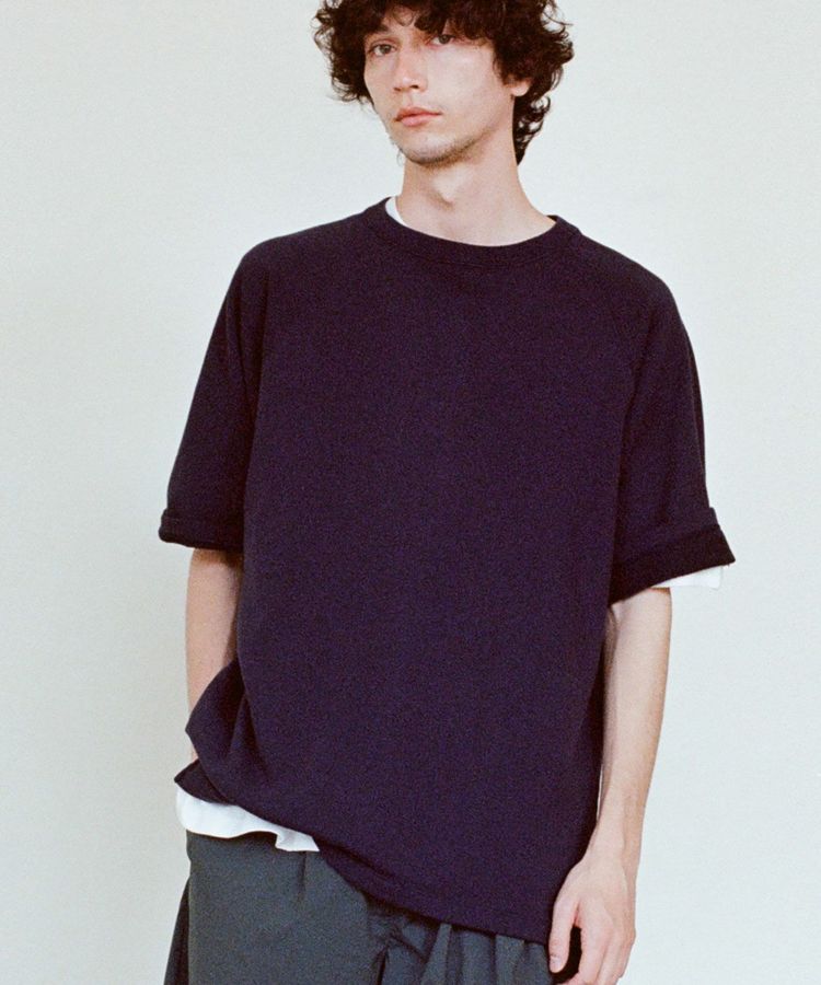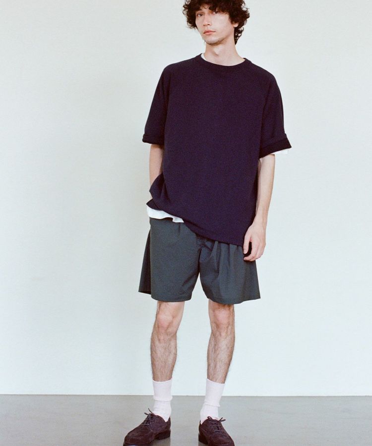 袖と裾はリブ無しの2本針始末にしているため、レイヤードを楽しめるアイテムに仕上げています。パンツのポケットに手を入れやすいよう切り抜きスリットを作り、無駄のない動きをサポートするディテールを取り入れています。