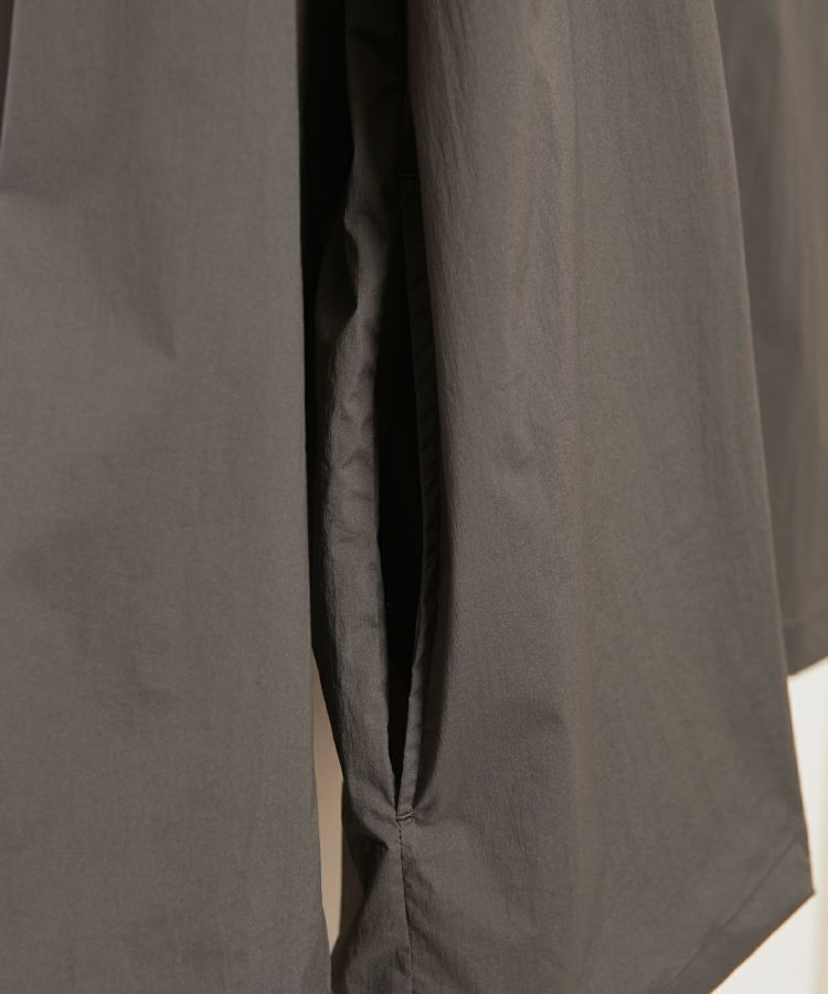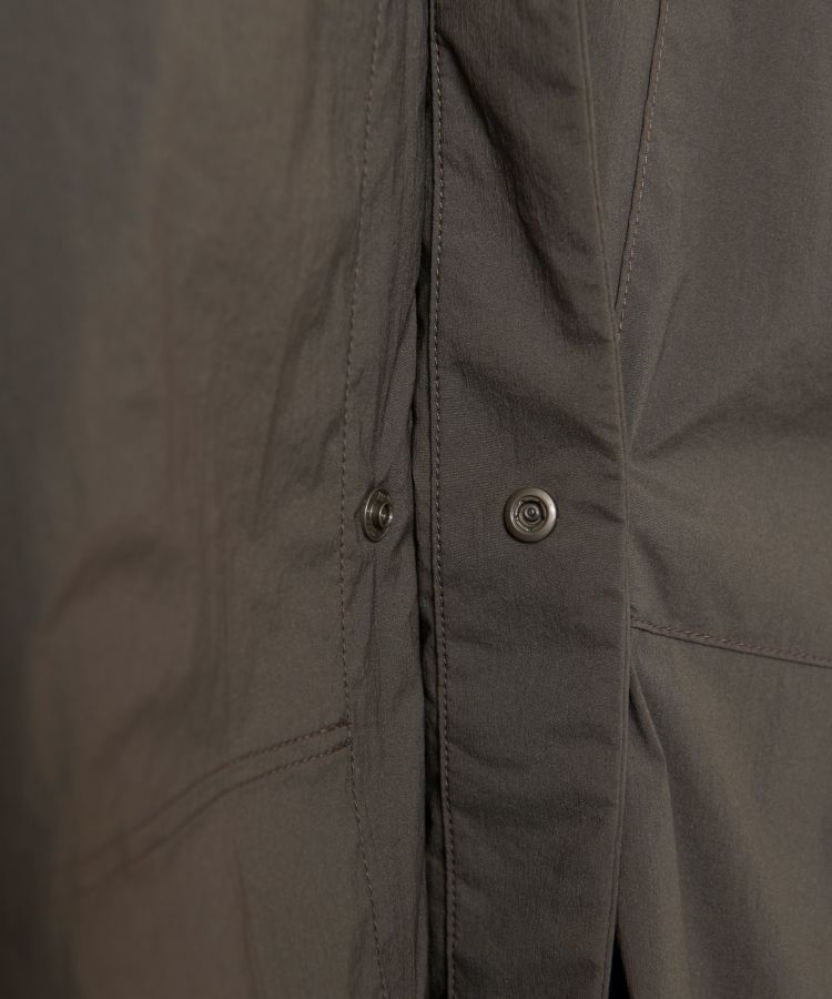 生地は20デニールのナイロンを使用。ナイロンであるにも関わらず、ストレッチ性と強撥水性を持っており、また細番手のため、軽量でイージーに着用できます。生地特性であるストレッチ性・撥水性とデザインがマッチしている着心地のよいアイテムに仕上がっています。