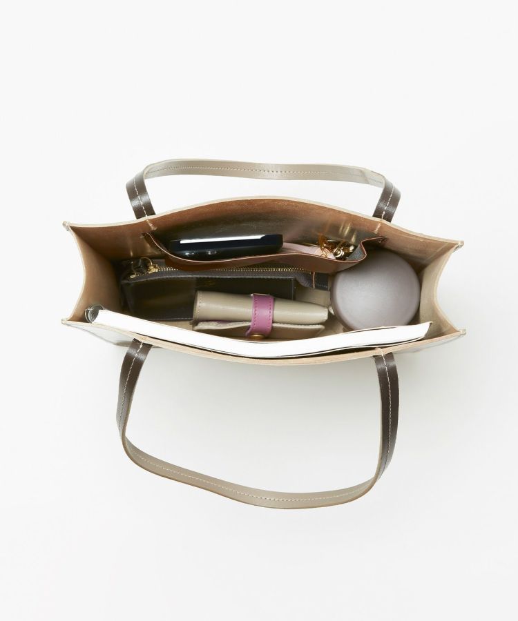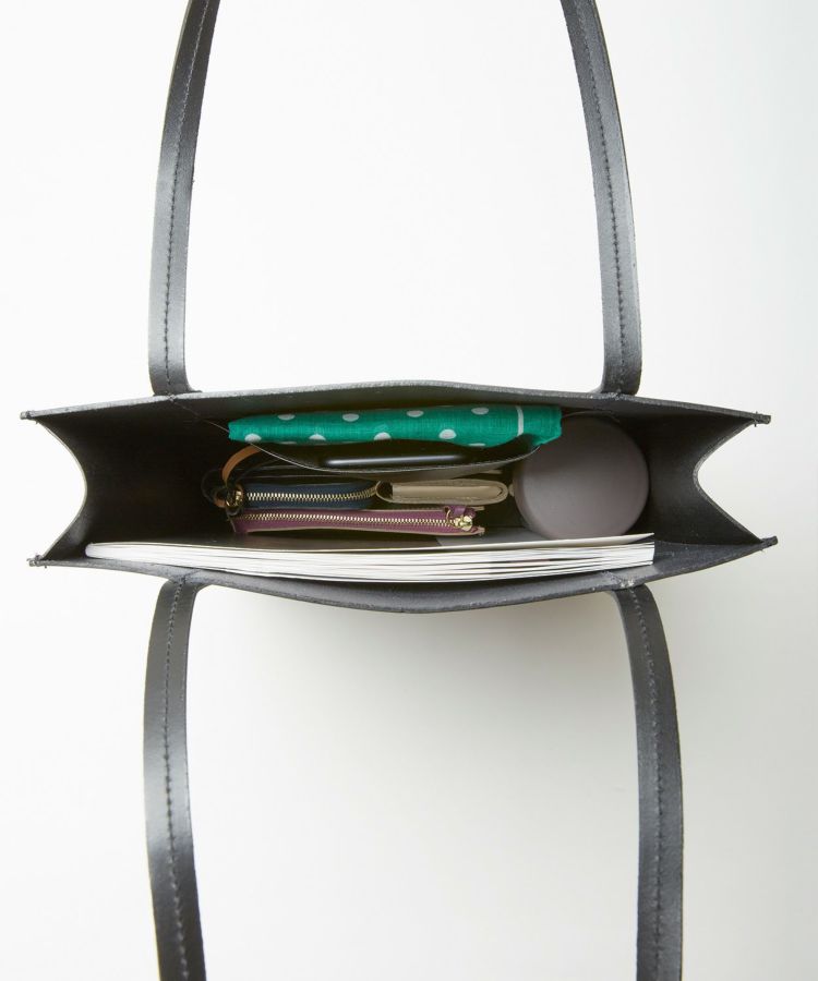 バッグのマチ(厚み)は約6cm。パッと置いた際に自立するので、訪問先で足元に置いても安心な仕様。見た目以上に荷物がたっぷり入る容量を持っています。持ち手を細く(幅1.2cm)したことで女性が持ちやすい華奢なデザイン。内ポケットが施されているので、スマートフォンや鍵など細々したものがカバンの中で迷子になることもありません。