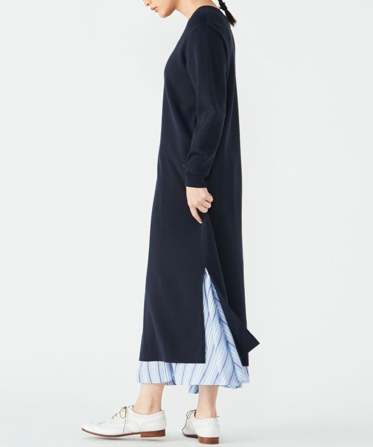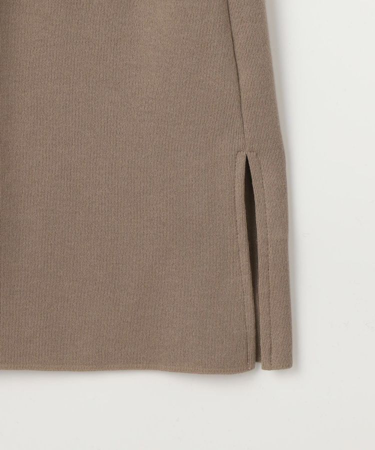 裾には長めに取ったスリットが入っており、スカートの柄をアクセントとして見せるなど、ボトムスとのレイヤードを楽しむことができます。余計な装飾がないミニマルなデザインにより、どんなアイテムとも合わせやすいのも魅力です。