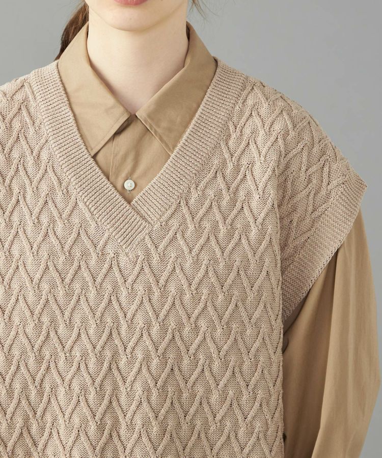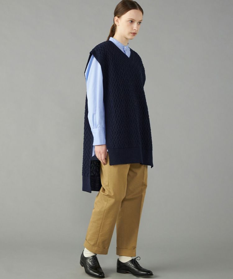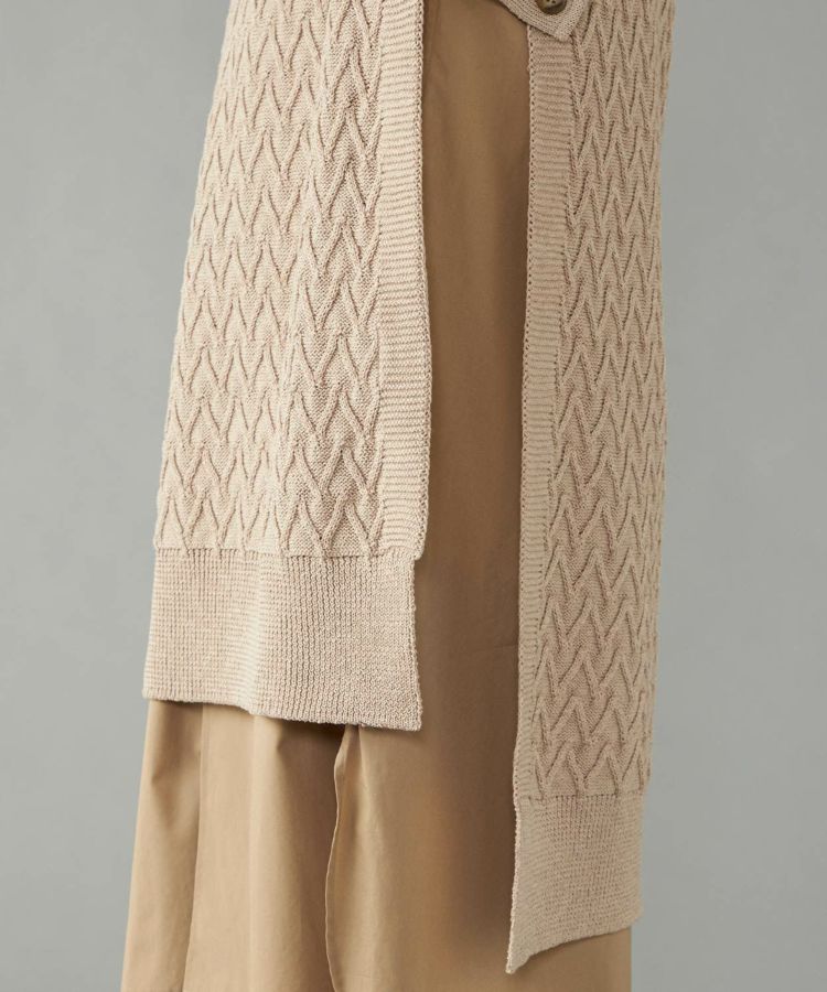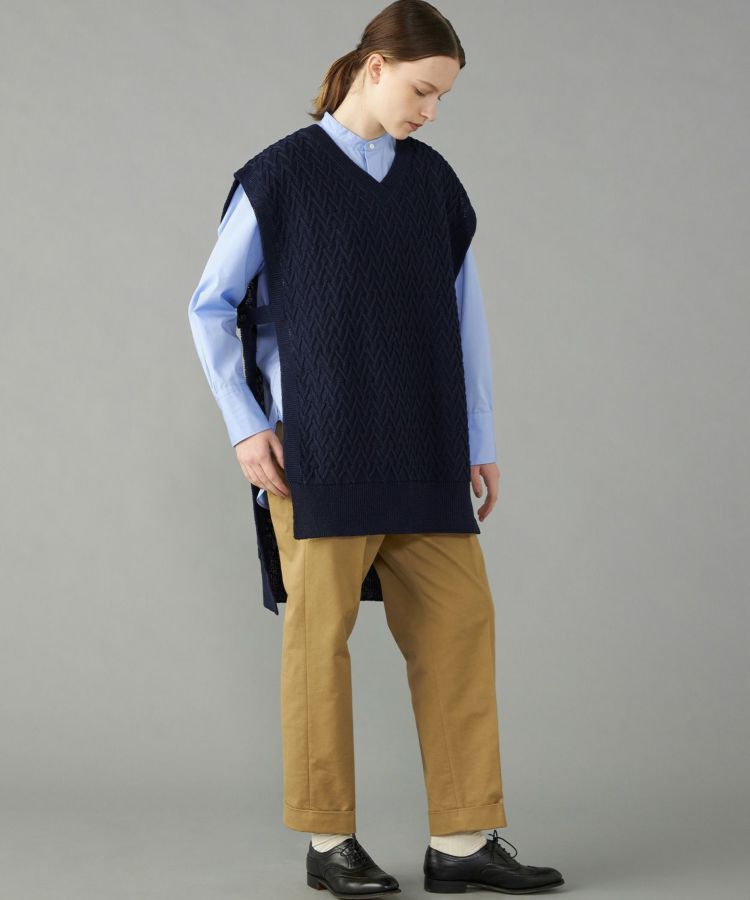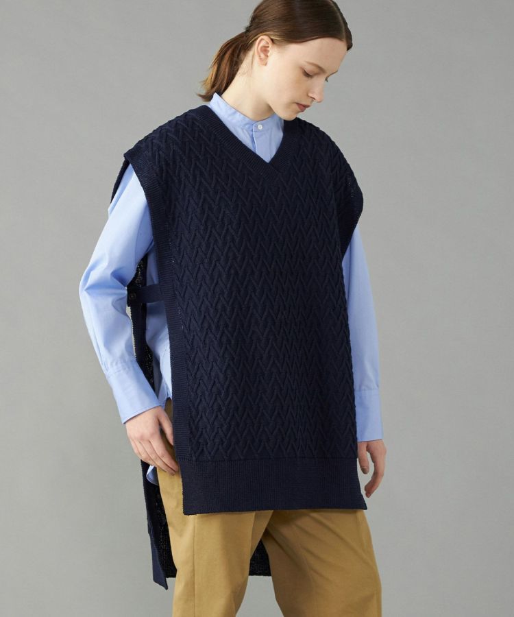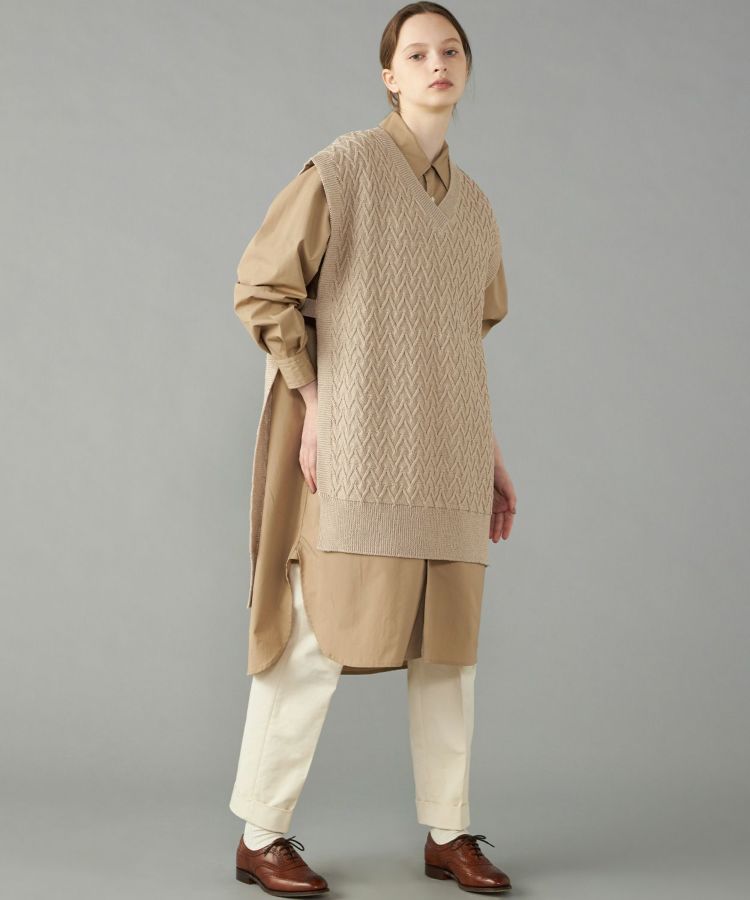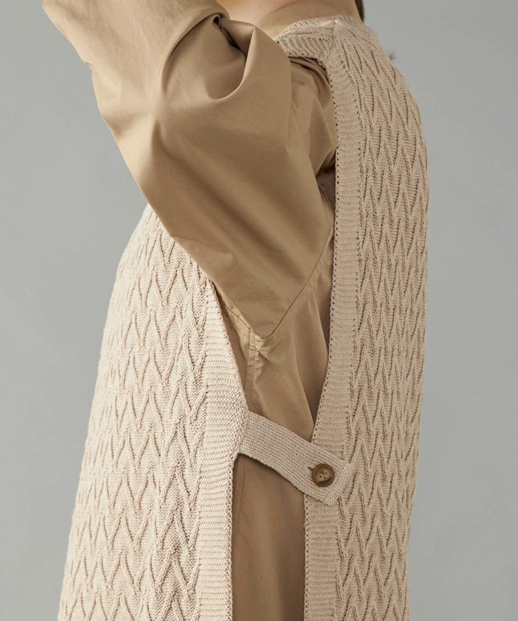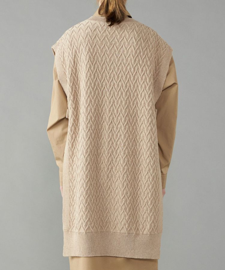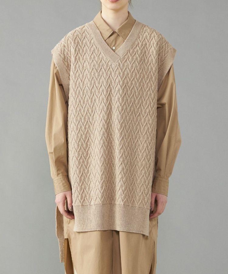変則タック編みの一種でオリジナルのへリンボーン柄が組まれています。脇はタブ留めのみになっているのでアームにゆとりがあり、シャツやカットソー、ワンピースなどのアイテムとレイヤードし易いデザイン。ロング丈でバランスがとりやすくコーディネートの幅も広がり、長いシーズンで着用いただけます。