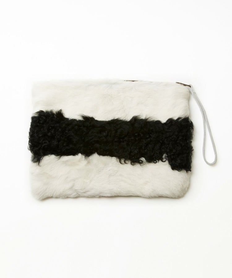 2種類のシープスキンを配色で切り替えたストラップ付きムートンクラッチバッグ。