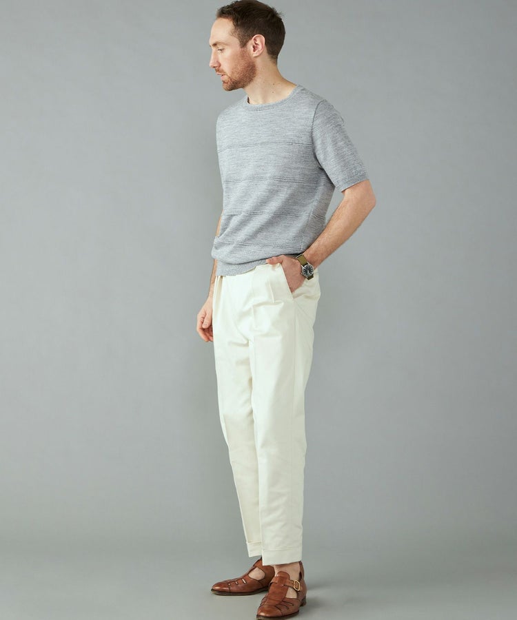 防縮ウールの抗菌・防臭機能と夏の定番となるラミー(リネンの一種)の糸を使用。汗ばんでも肌に密着せずに汗を素早く吸収し放出するため気化熱を奪い涼感があります。シャリっとした肌触りで春夏の季節におすすめ。ジャケットにも合わせ易いキレイめで上品なTシャツです。