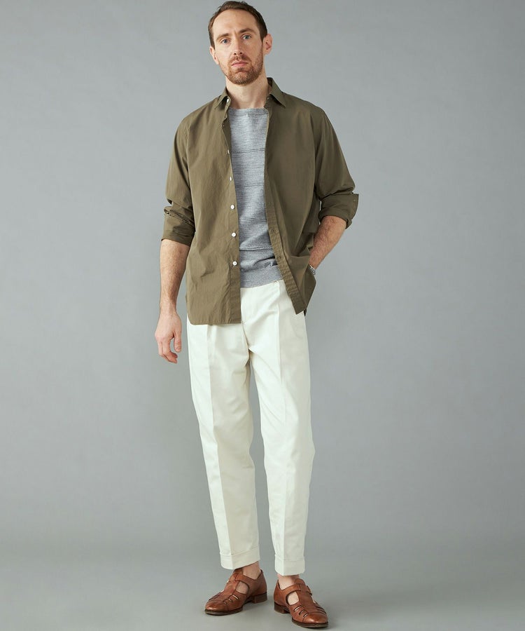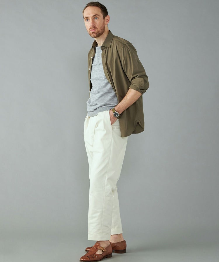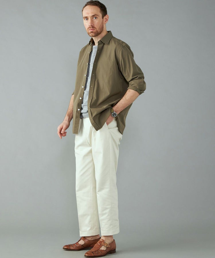 ウール50%・ラミー50%の素材感が際立つ軽やかな風合いが特徴。ラミーはリネン(麻)の一種で繊維が太くて長く、天然繊維の中で最も強度に優れています。天然繊維の中でも最もシャリ感があり、汗ばんでも 肌に密着せずベトつきません。汗を素早く吸収し、放出するため気化熱を奪い涼感があります。