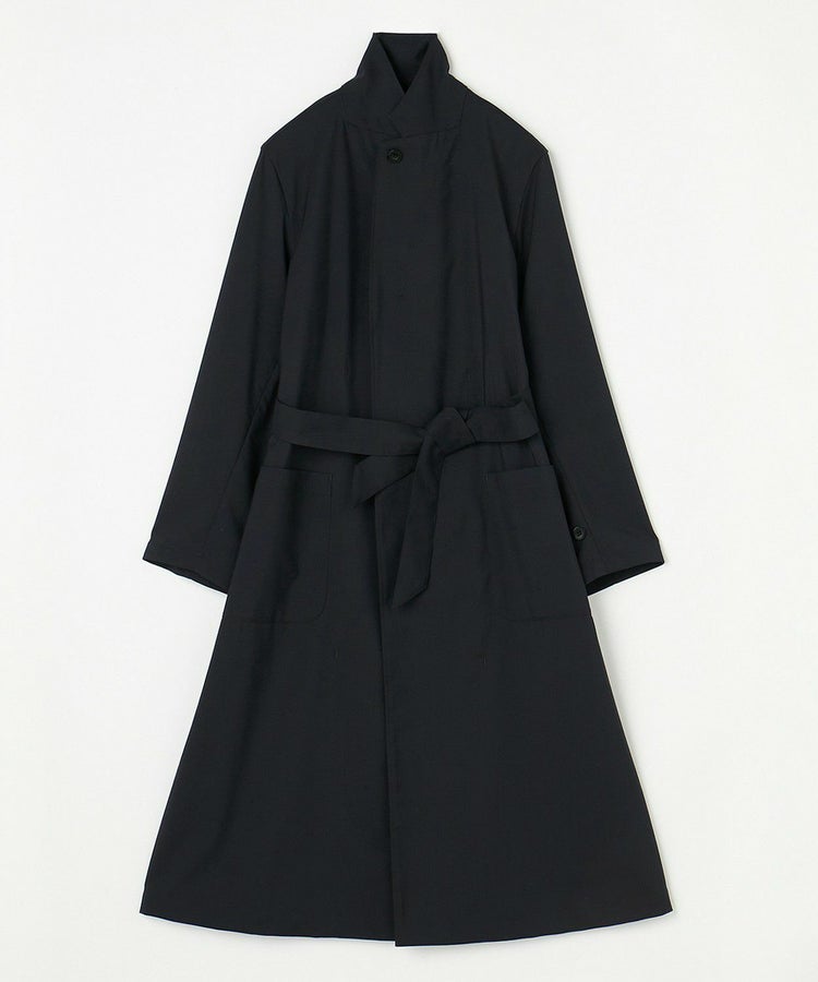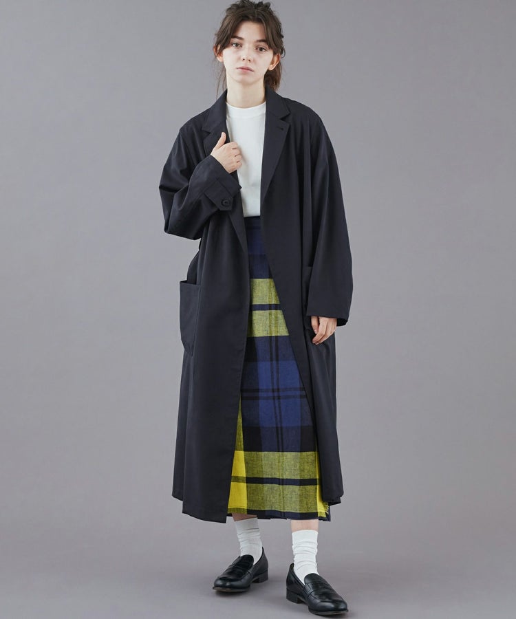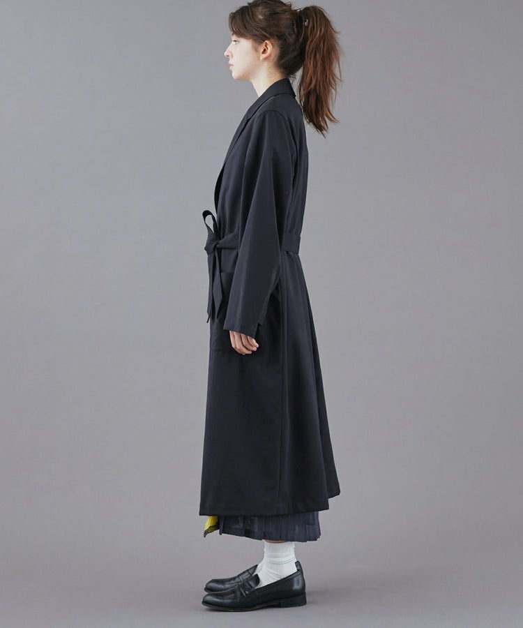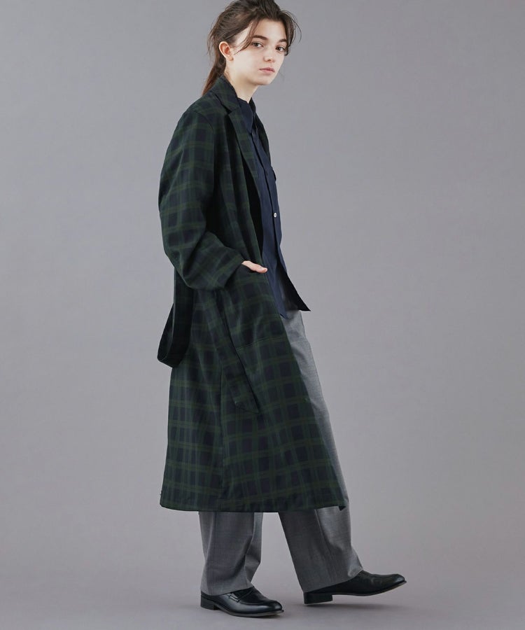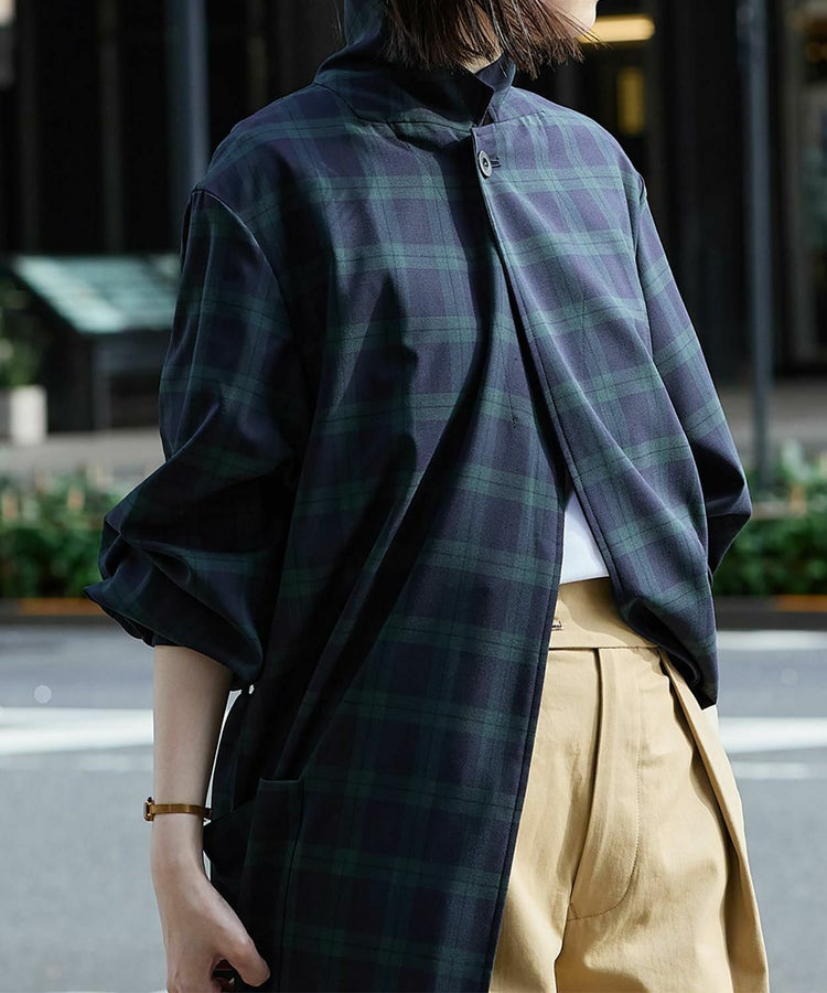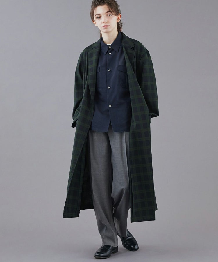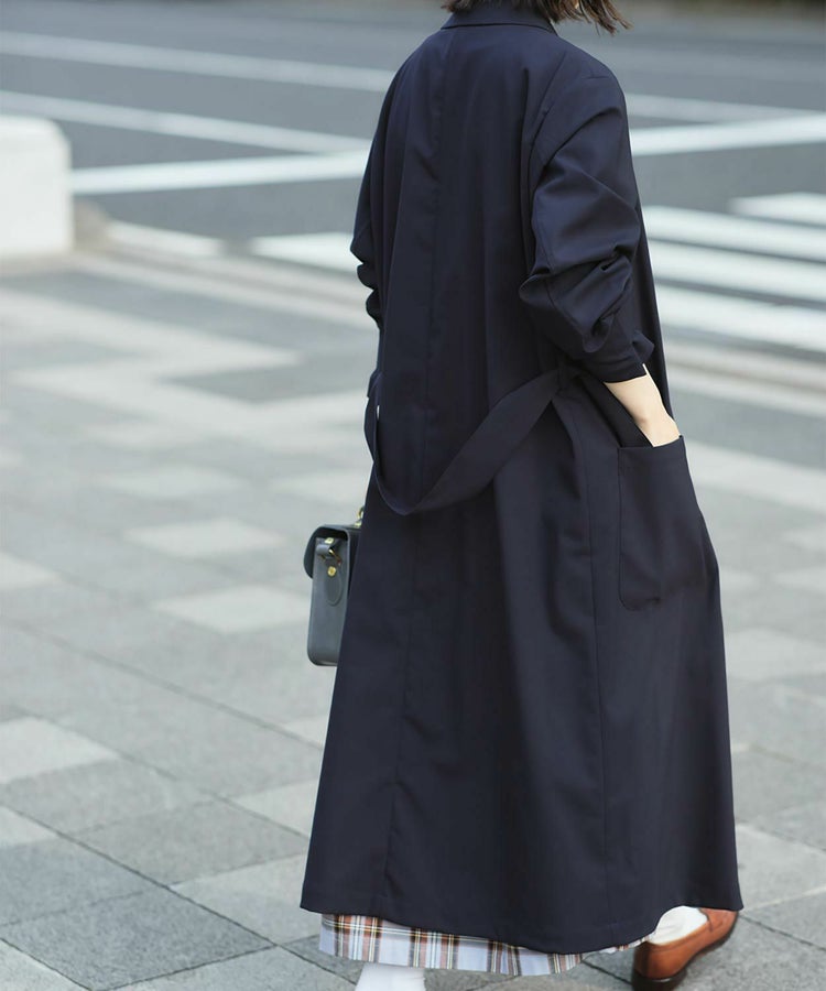 クラシックな紳士用アウター「チェスターフィールドコート」を春夏秋の3シーズン使えるライトアウターとして再構築しました。素材には、ウール50% ポリエステル50%の生地を使い、薄手ながらも高級感・ハリを適度に残した仕上がり。贅沢に生地を使っているものの、薄手の生地は”すとん”と下に落ちるので全体のシルエットは膨れず、すっきりとした印象です。また、襟元はスタンドカラー仕様でも着用することができる2WAYで、袖口もフラップ付きで絞ることが可能。フロントの開閉、さらにウエストベルトをどう結ぶか、等の着こなし方によって大きく印象を変えることができます。肩のラインは、わずかにドロップショルダーになっており、さらりと羽織るだけで適度なリラックス感が生まれます。夏にはワイドパンツやTシャツに合わせて、ロングシャツのような感覚でラフに着こなすスタイリングがおすすめです。