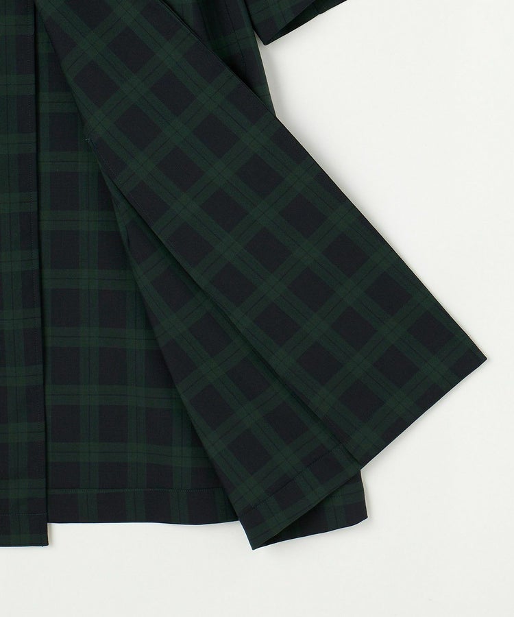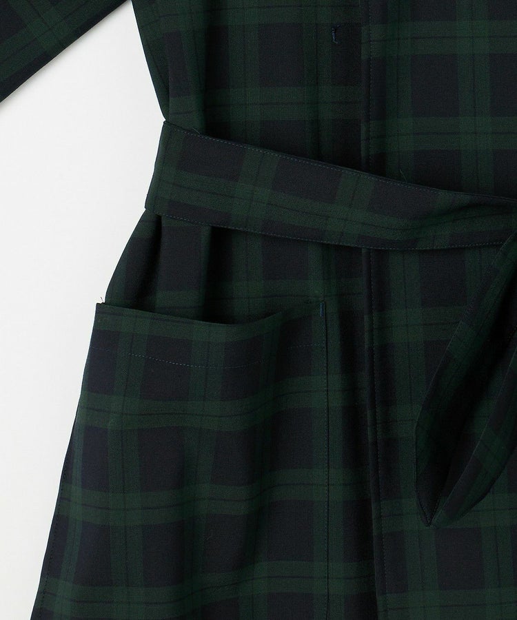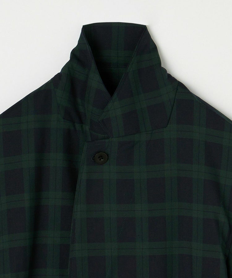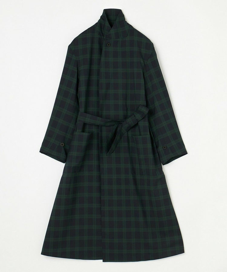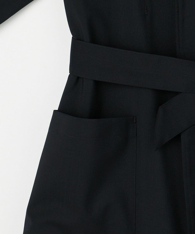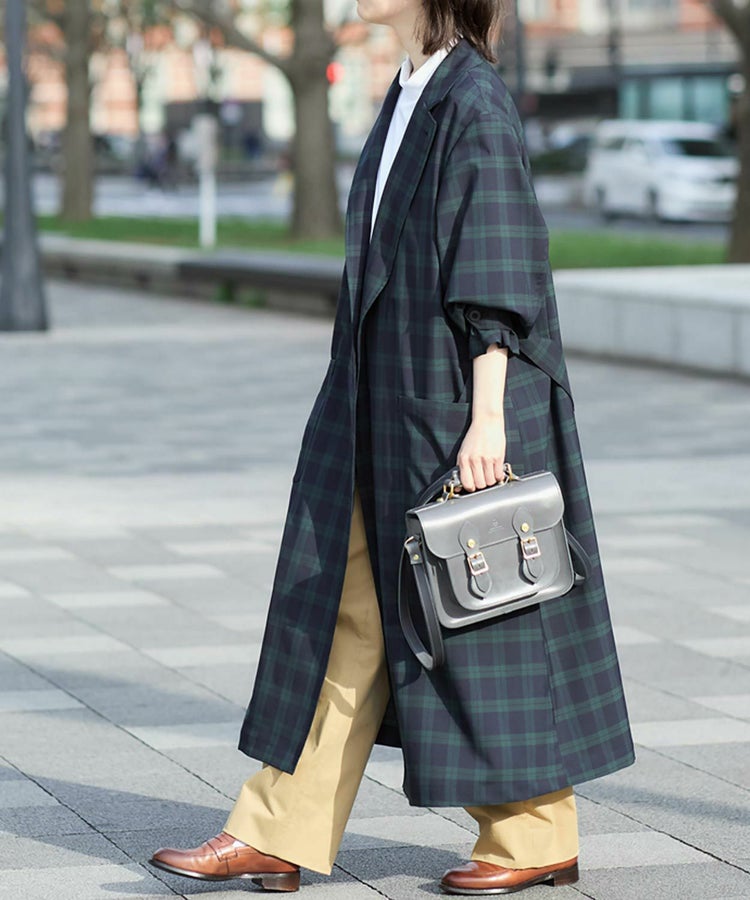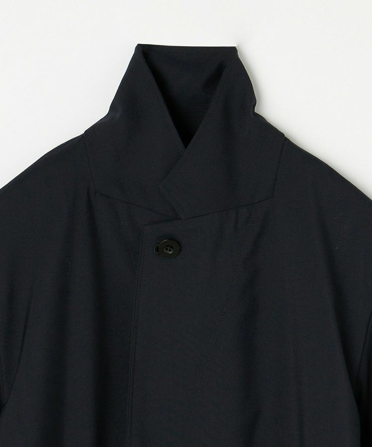 クラシックな紳士用アウター「チェスターフィールドコート」を春夏秋の3シーズン使えるライトアウターとして再構築しました。素材には、ウール50% ポリエステル50%の生地を使い、薄手ながらも高級感・ハリを適度に残した仕上がり。贅沢に生地を使っているものの、薄手の生地は”すとん”と下に落ちるので全体のシルエットは膨れず、すっきりとした印象です。また、襟元はスタンドカラー仕様でも着用することができる2WAYで、袖口もフラップ付きで絞ることが可能。フロントの開閉、さらにウエストベルトをどう結ぶか、等の着こなし方によって大きく印象を変えることができます。肩のラインは、わずかにドロップショルダーになっており、さらりと羽織るだけで適度なリラックス感が生まれます。夏にはワイドパンツやTシャツに合わせて、ロングシャツのような感覚でラフに着こなすスタイリングがおすすめです。