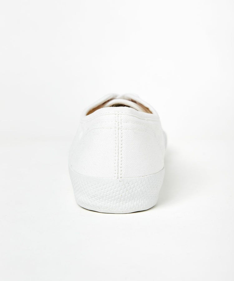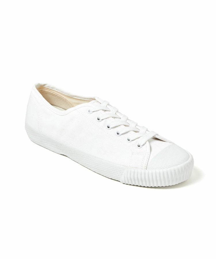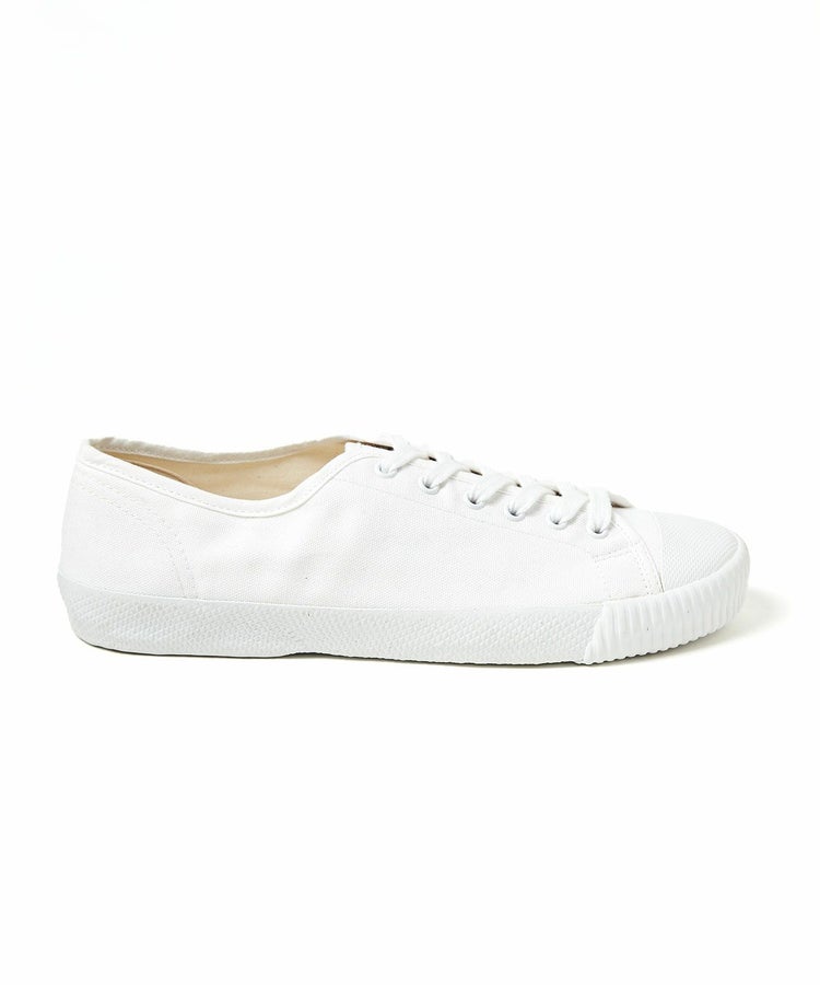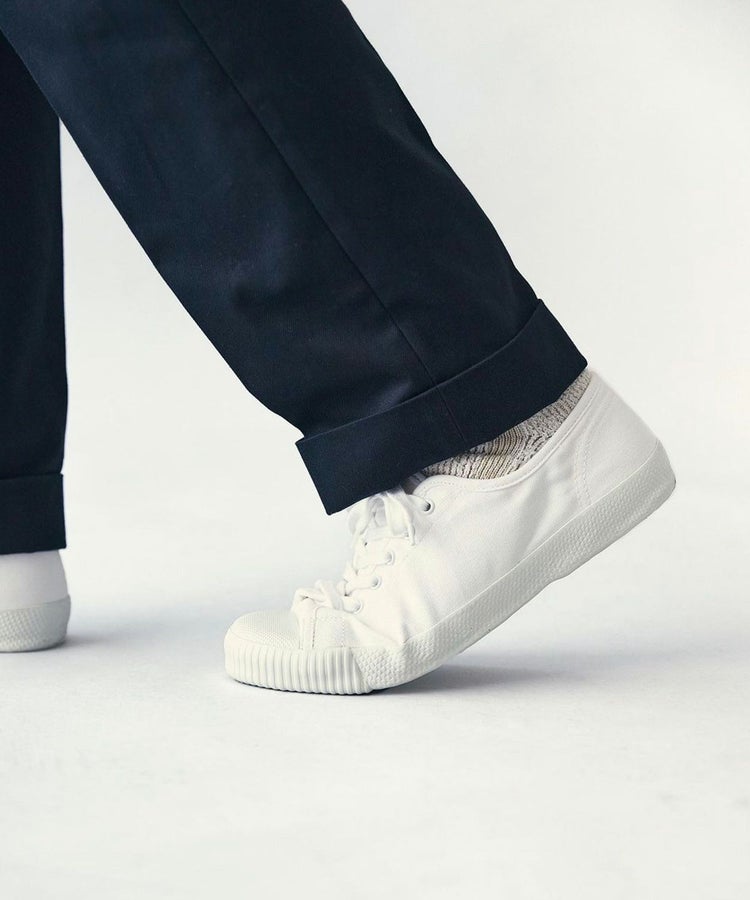イギリスの老舗テキスタイルメーカー、「Brisbane Moss(ブリスベンモス)」社のキャンバスコットン「Milton(ミルトン)」をアッパーに使用した別注モデル。通常展開のないイギリス由来の生地を採用しました。ゴム底と上部との境線が船の満載喫水線(プリムソル・ライン)を思わせる事から総称「プリムソール(※)」と呼ばれています。