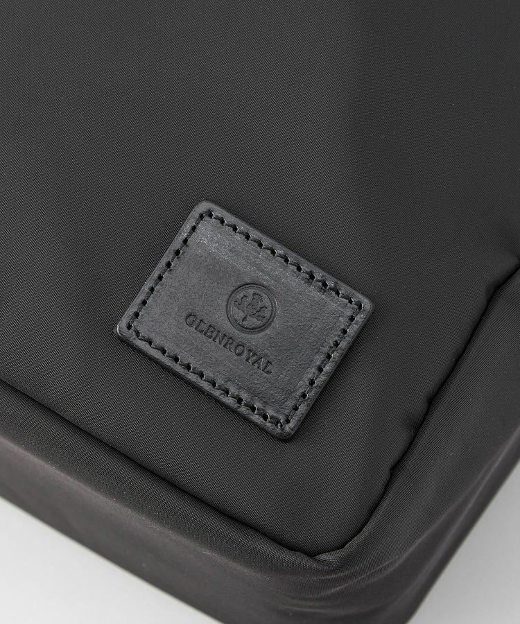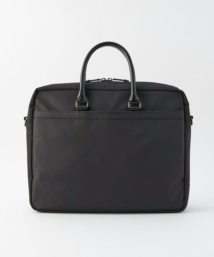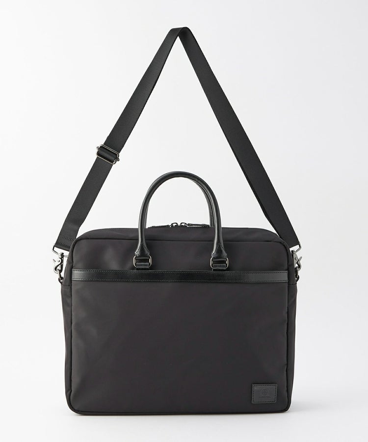 持ち物が多い時にも扱いやすいサイズ感。取り外し可能なショルダーストラップ付きで、2WAYで使用可能です。メインポケットの全面に保護パッドが入っているため、パソコンなども安心して持ち運べます。素材は程よい光沢があるナイロンツイル(撥水加工)を用い、ポケット口部分などにブライドルレザーをあしらうことで品の良さを演出。シンプルながらも高級感のあるアイテムです。