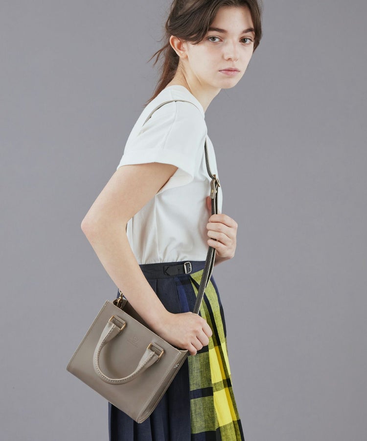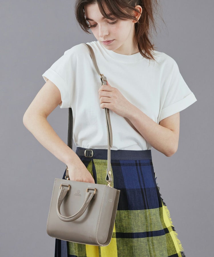 取り外し可能なショルダーストラップ付きで2WAY使用可能です。見た目は小さく見えますが350mlのペットボトル、財布、ポーチが入るくらい、充分に容量があります。シンプルで上品な見た目で、オンオフ問わず幅広いシーンでお使いいただけます。ハンドル部分が角カンで倒れるため、保管しやすいところも嬉しいポイントです。