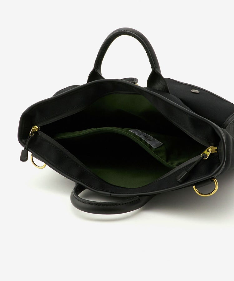 素材は撥水コーティングを施した、張りのある混合素材を表地に採用。裏地との間にラバーフィルムをボンディングし、水が中まで染み込まずバッグの中身が濡れるのを防いでくれます。上部は止水ジップを使用しており、さらに防水性を高めたデザイン。取り外し可能なショルダーストラップ付きで、2WAYでの使用が可能。ストラップは長さ調節ができ、機能面にも優れています。