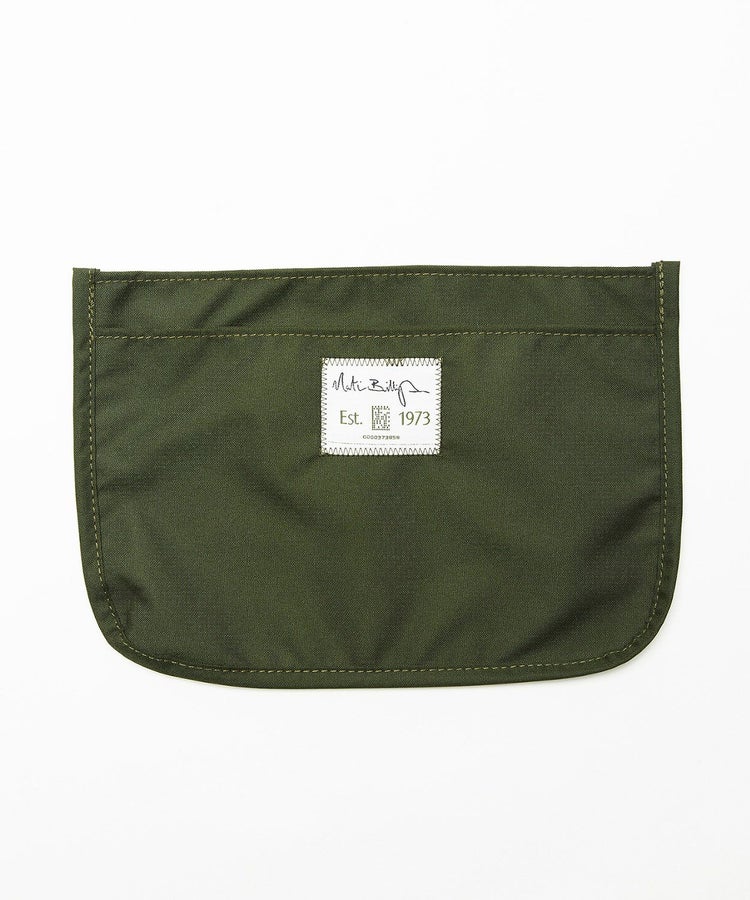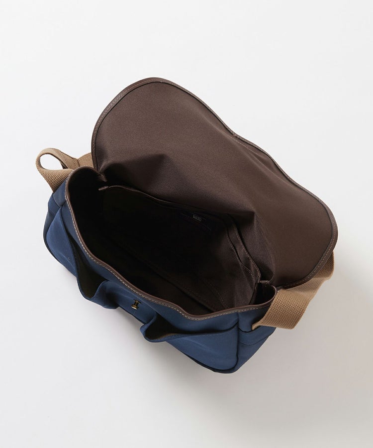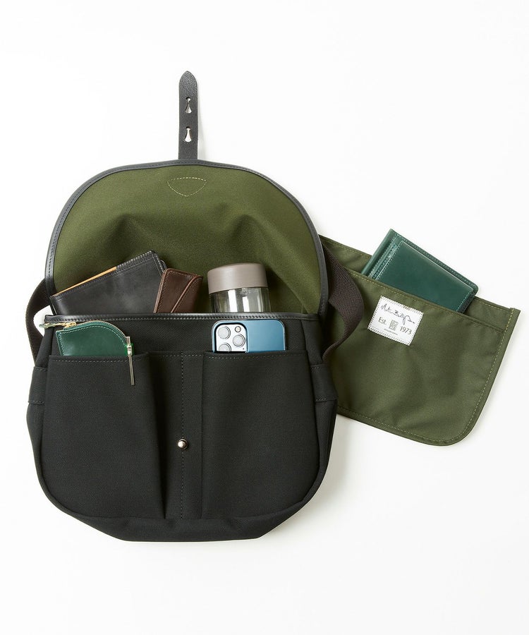 フラップを開けると、外側にスマートフォン、パスケース、キーケースなどが入るポケットが2つ。付属のオープンポケットは本体のバッグにスナップボタンで固定できるので、中身がすっきりと整理できます。留め具はギボシ仕様でスムーズな開閉が可能。耐久性の高いラバーボンディングコットン地とブライドルレザーを組み合わせたクラフトマンシップの感じられる逸品。