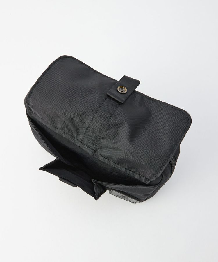 ショルダーストラップは取り外し可能で、ポーチとして2WAYで使用可能です。内側の両サイドにマチを作り、開きやすさも確保。ポケットが設置されており、小さい物を収納することができます。フロントポケットはスナップが2段階で留めることでき、背面のスナップテープで大きい鞄などに止めつけることも可能です。ナイロン生地にはアクリルをベースとしたバッグコーティング剤(広塗布用)を塗布し、優れたハリ感と撥水機能を持たせました。シーズン問わずお使いいただけるアイテムです。