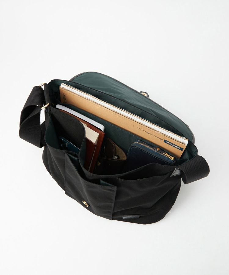 定番のブラック×ブラックレザーと、クラシカルな配色のベージュ×ブラウンレザーでの展開。裏地にはGLENROYALのBOTTLE GREENを連想させるカラーをチョイス。13inch程度のラップトップが入る大きさで、ブライドルレザーをフラップパイピングに使用した贅沢で高級感のある逸品。フラップを開けずに中身が取り出せるファスナー口と、肩が痛くなりにくいよう、太めのショルダーテープを採用するなど、機能面もプラス。ポケットも充実しておりフロント×3とPCが収納できる内ポケットを付けています。容量も充分で、かつ軽量なため、タウンユースからレジャーなど幅広くお使いいただけます。