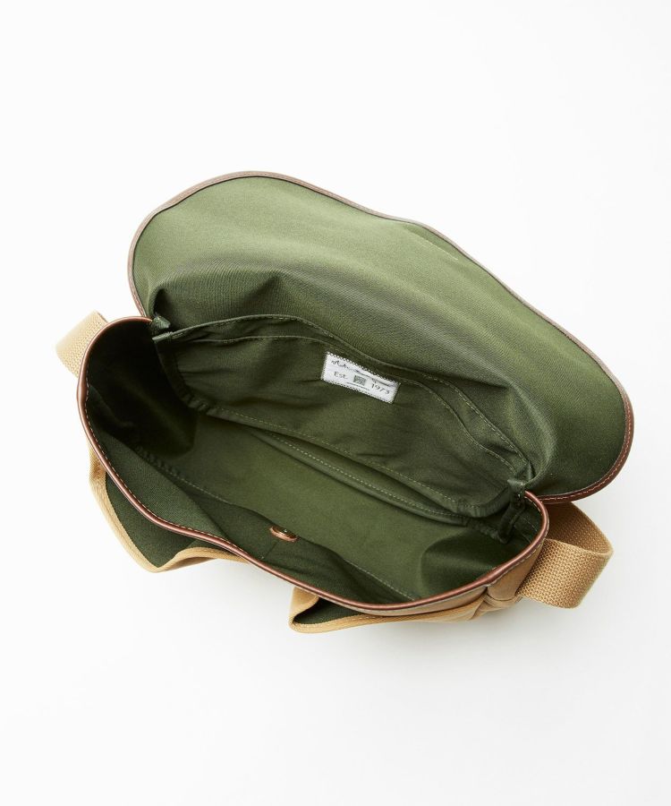 フラップを開けると、外側にスマートフォン、パスケース、キーケースなどが入るポケットが2つ。付属のオープンポケットは本体のバッグにスナップボタンで固定できるので、中身がすっきりと整理できます。留め具はギボシ仕様でスムーズな開閉が可能。耐久性の高いラバーボンディングコットン地とブライドルレザーを組み合わせたクラフトマンシップの感じられる逸品。