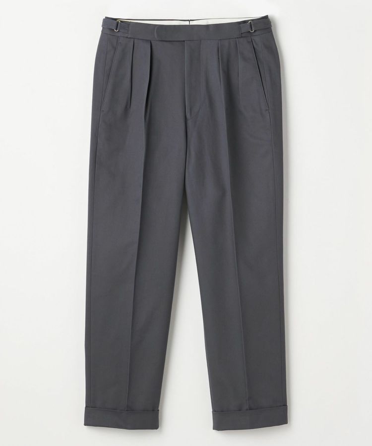 従来のモデルから持ち出しの長さと先の形状を全体のバランスを考慮しアップデート。イメージソースとしたのは1960年代のロイヤルネイビー(英国海軍)のホワイトドリルトラウザーズ。ベルトループが無い“ベルトレス”で穿くクラシックなディテールで英国らしい上品さが魅力の一つ。サイドアジャスターはバックル調整ではなく、ボタン調整になっております。本来のシルエットよりも膝と裾巾を細くしテーパード感をやや強めたオリジナルバランス。パターンに振り込みを入れて、真っ直ぐ立った時に、キレイにストンと落ちるよう工夫を入れ立ち姿の美しいシルエットにも拘りました。ヒップサイドの脇線は真っ直ぐではなくカーブを強くし、もたつかないようフィットするデザインに。またマーベルト(※)仕様のためシャツをタックインした際にズリ上がり難くなっております。オンオフがシームレス化する今のライフスタイルに最適なパンツです。