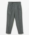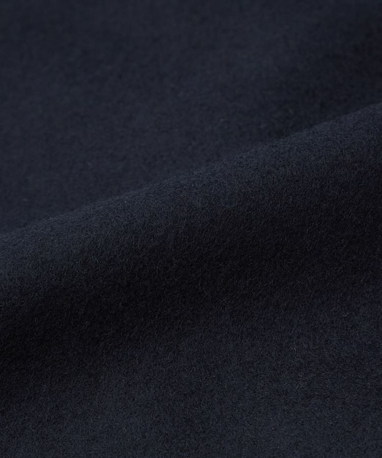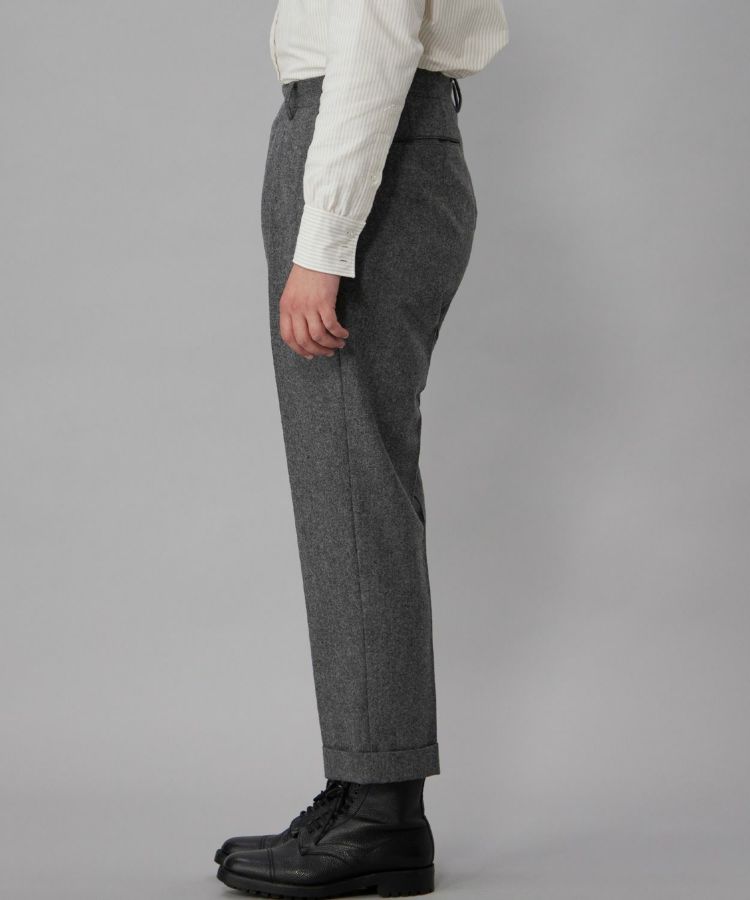 良質なメリノウールでヴァージンウール100%の原毛を使用。オーストラリアンメリノウール100%の生地は本当に今は貴重です。ナイロンを入れる意味合いとしては縮絨の工程を行いやすくする為。本来フランネルという生地は10番単糸や12番単糸の紡毛糸で作製するのですが、この生地は細番紡毛糸16番単糸を使用しています。フランネルは何度も縮絨を繰り返し作製。現在ではこの工程を省いてしまっているものもフランネルとして出回っているものがありますが、オフィサーパンツの生地は縮絨を何度も行い、本来のフランネル生地を工程を得て作られています。また10番単糸で作製すると旧態依然〈1990‘Sそのまま〉の生地になってしまうので16単糸を使用し膨らみ、柔軟性、光沢感を持たせ高級感のある素材に仕上げています。