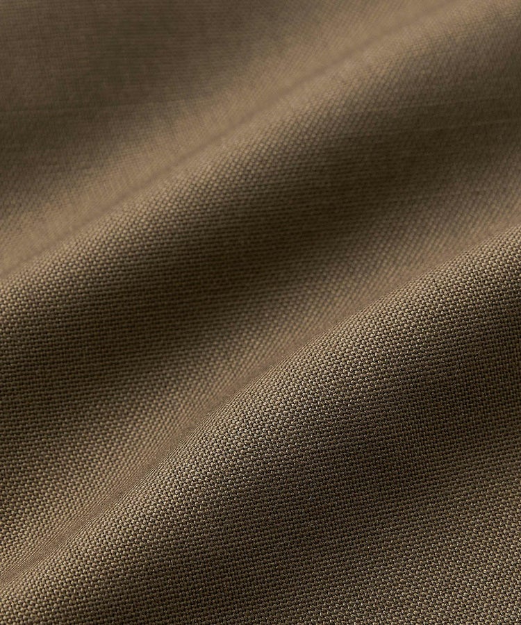 生地は1mあたり700回も撚りをかけた強撚糸を使用しており、サラッとした肌触りです。また撚りの反発力によりシワになりにくく、また糸に隙間が生じる事で吸湿性・通気性に富みます。適度な目付があり、シーズンレスで使える定番素材です。