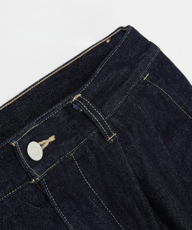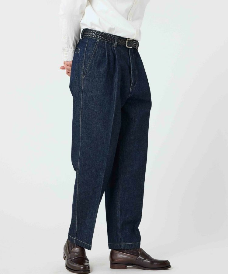 センタークリースを通したドレストラウザーのパターンをベースにしながら、縫製はあえてカジュアルパンツ専門の工場で行うことで、上品さとラフさを兼ね備えた一本に仕上げました。ヒップやワタリにはゆとりを持たせ、裾に向かって自然に細くなるワイドテーパードシルエットが特徴です。生地には13ozのスラブデニムを使用し、加工は行わず製品洗いのみを施すことで、穿き込むほどに表情が変わる、経年変化を楽しめる仕上がりにしました。