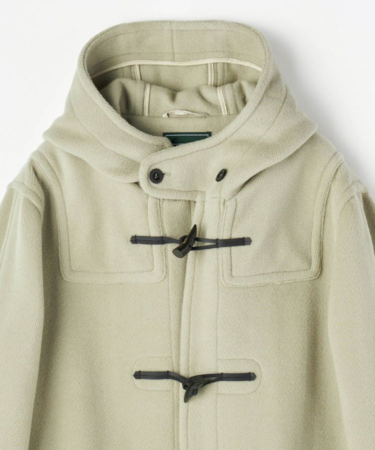 GLENMOREの作るダッフルコートは海軍系のラギットな麻ひものダッフルコートではなくMOORBROOK社の肉厚だけど軽いヘリンボーン地とレザーホーントグルを用いた造りは高級感を醸し出し業界でも一目置かれるコートでした。当時のアーカイヴを元にイギリス国内の工場を探し、 パターンも変わらず、マラリウス社(イギリスのミル)の生地を使用して仕立てた“90年代のダッフルコート”を象徴する古き良きダッフルコートです。