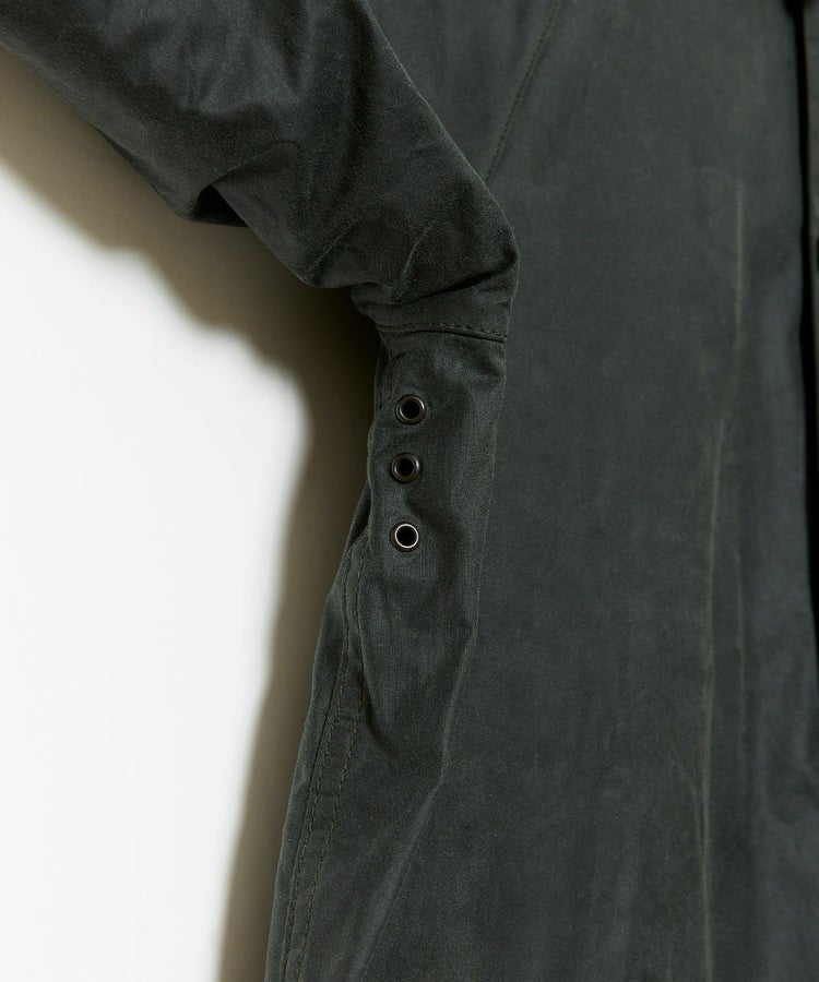 生地には、重すぎず軽すぎずのワックスドコットン(6オンス)を採用。高い防水性はそのままに全天候向きで動きやすく、悪条件や激しい使用にも耐える厚さです。袖口はスナップボタン仕様になっており、インナーに合わせてボリュームの調節が可能です。