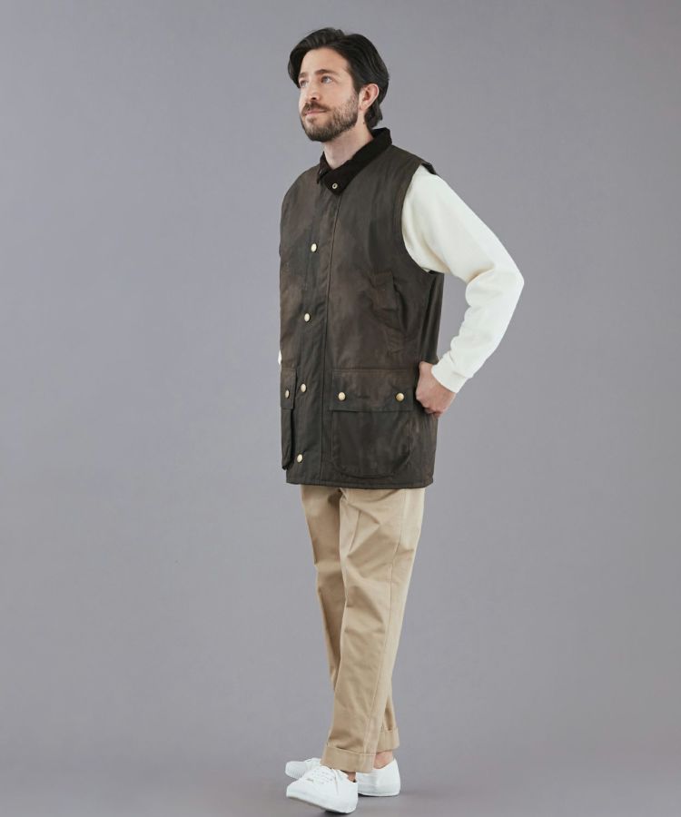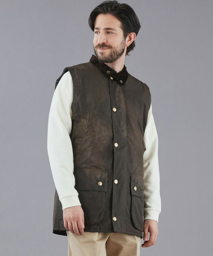 ワックスコットンとコーデュロイの襟をアクセントに、ビデイルとも共通するポケットの配置や、ライニングには象徴的なタータンチェックを施していることなどが特徴。また、ベストであることで素材の主張も程よく控えめになり、シャツやニットの上からで気軽に楽しむことができます。これからの季節にロングスパンでの活躍が期待できる一枚です。