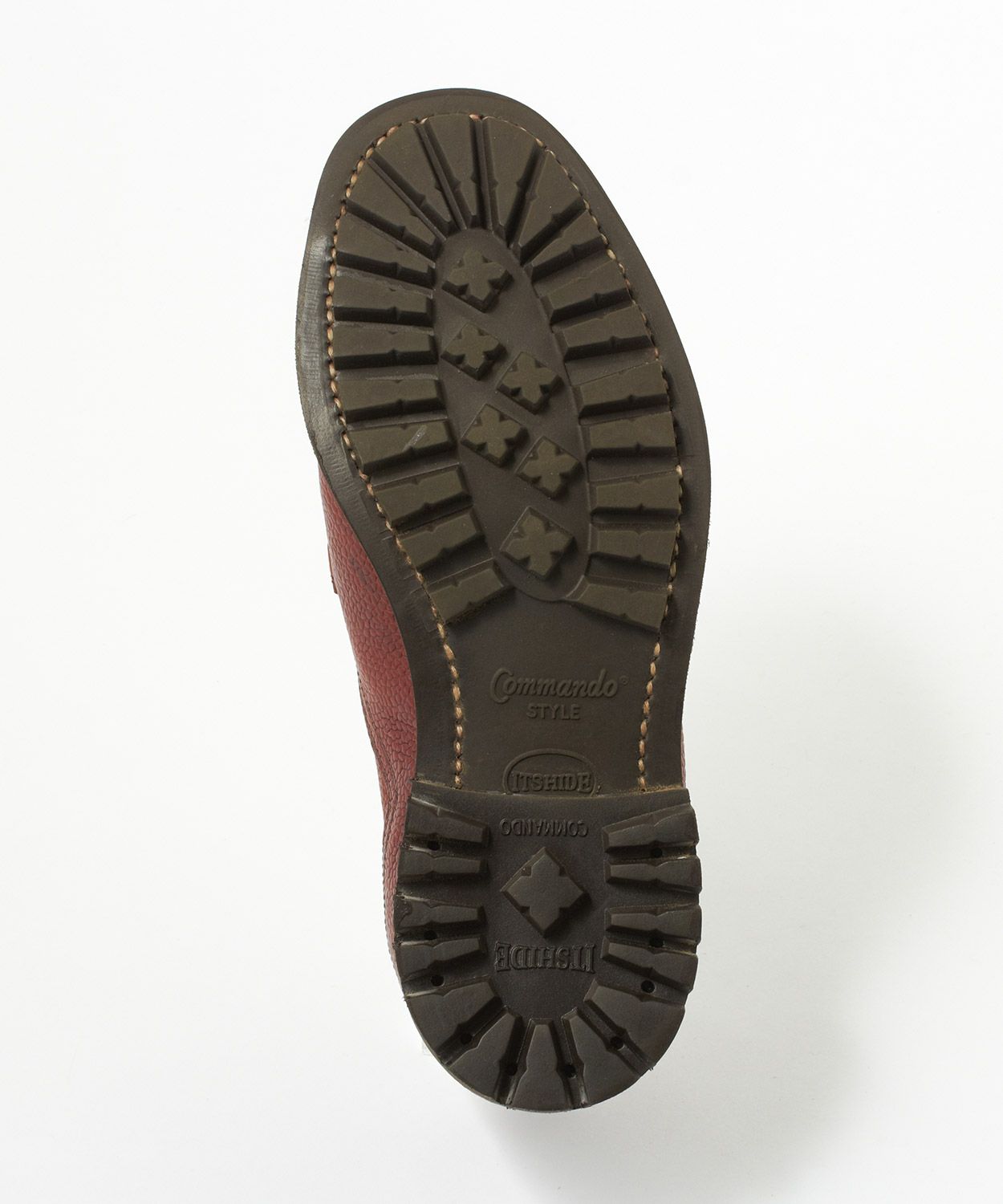 ソールには、さまざまなバリエーションが存在するラバーソールの中でも、極めて高いグリップ力と安定性を誇る「コマンドソール」を採用。険しい山道やぬかるみ、砂利道など、コンディションの悪い地面用に開発され、タウンユースでも快適さを発揮し、雨上がりやゴツゴツした石畳などを歩いても疲れにくいのが特徴です。サイドから見てもわかるほどくっきりとした凹凸が刻まれがっちりと厚みがあるため、タフで男らしい印象を演出してくれるのも魅力。