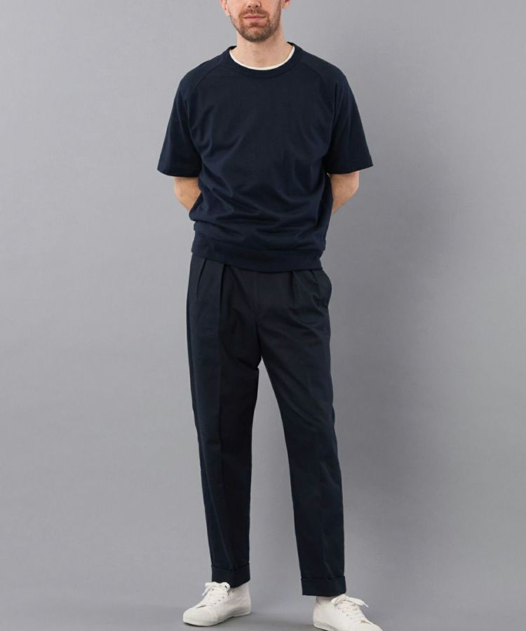 スタイリスト 四方章敬さんが監修した一枚で主役になるアウターTシャツと、シンプルな着こなしに上品なワンポイントを添えてくれるバンダナでつくる、夏のスタイリングセットです。英国らしさを感じるラグランスリーブが特徴的なアウターTシャツは、四方さん曰く“スウェットに近いTシャツ”をイメージしたという一枚。カジュアルになりすぎないよう上品さを追求したバランス、生地感が魅力です。やや深めのネックは、Tシャツの重ね着や首元にバンダナをまいたスタイリングにもよく合います。