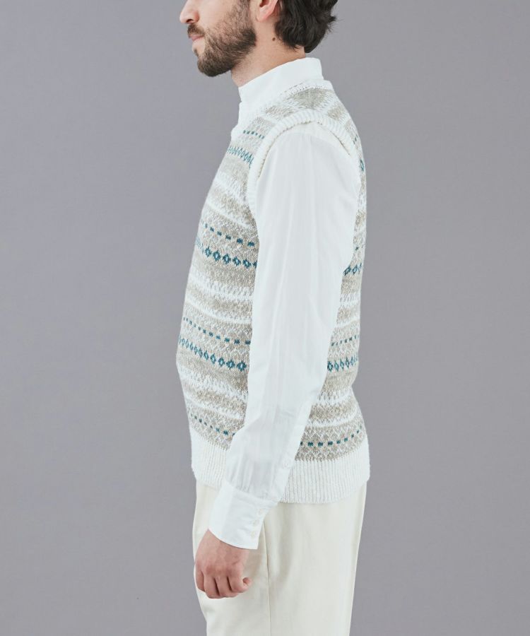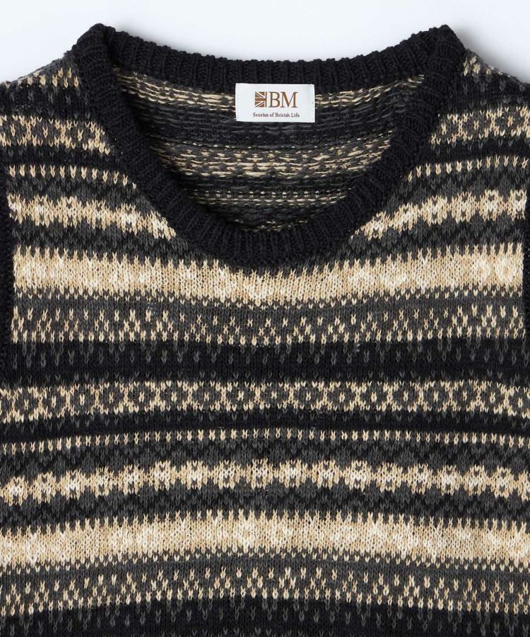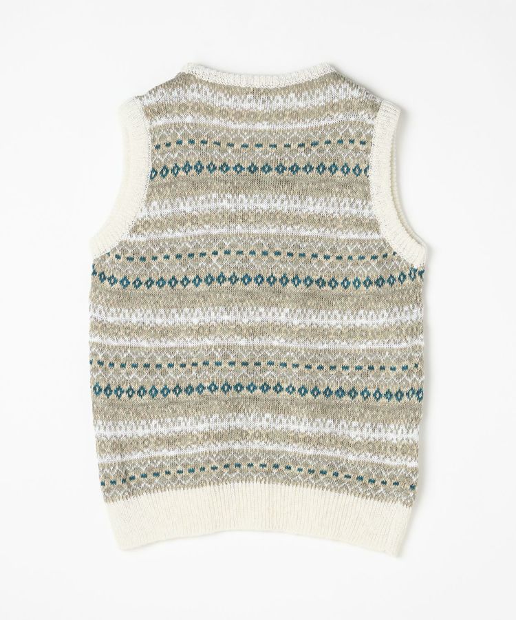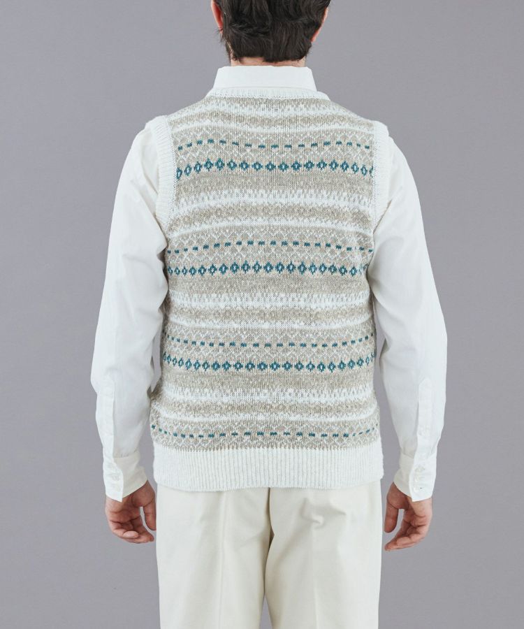 スコットランド発祥のクラシックなパターン、フェアアイルを取り入れた、英国らしいカントリースタイルのニットベストです。