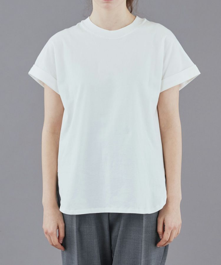 袖口の折り返しと後ろのタックデザインが効いており、一枚でコーディネートがまとまります。春夏はもちろん、インナーとしてレイヤードにも活躍してくれるので一年中使える万能アイテムです。タックインしやすいように、裾はラウンドでサイドにスリットが入っており、ボトムスとも相性がよく、フロントのみタックインしたり、タックアウトしてパンツやスカートに合わせることができます。シンプルながら、ディティールにこだわったデザインと、シルエットが魅力なTシャツは、ジャケットの下やカジュアルスタイルまで幅広く対応が出来ます。フレンチスリーブのような袖口は、さりげなく二の腕をカバーしてくれます。生地は適度な厚みがありながらも柔らかく、着心地の良いコットン100%素材です。