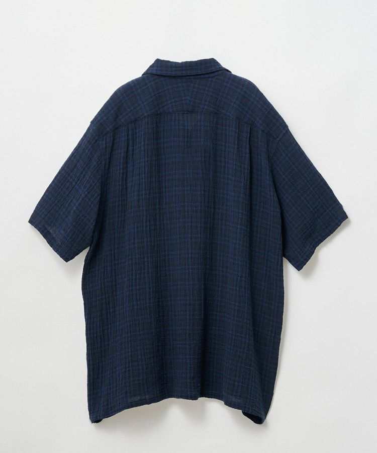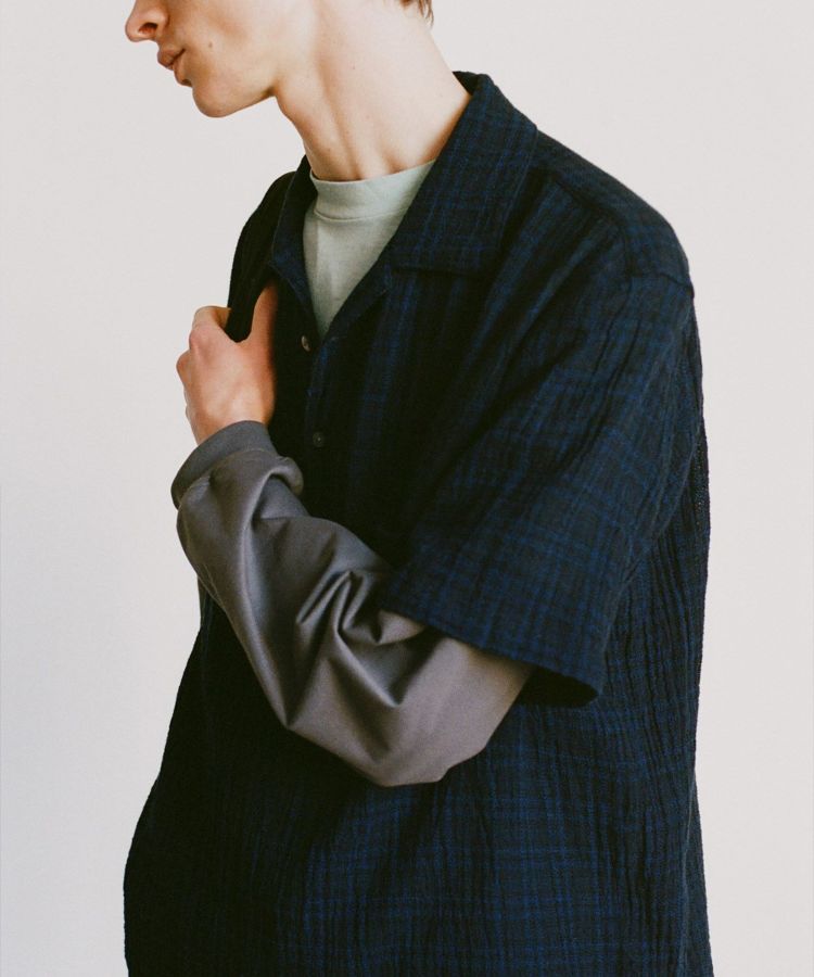 素材は強撚糸のコットンを使用したパナマクロスをオリジナルで製作。希少なマシンを使い、糸が切れないようにゆっくりと時間をかけて織り上げるからこそ生まれる、独特な風合いをもつ生地に仕上がっています。メッシュならではの風が抜ける清涼感があり、汗をかいてもすぐ乾き、肌にくっつかない適度なシャリ感の心地よさが魅力です。度詰めになりすぎない若干のゆるさのある生地感が、ユニークなしっとり感を作り出してくれています。