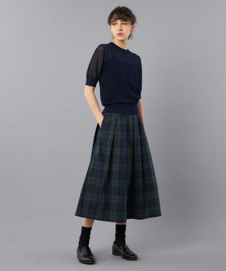 イージーケア素材で天然繊維の質感と合成繊維の機能性を両方兼ね備えています。袖口をパフスリーブにし、裾を長めのリブ仕様に設計することで女性らしいシルエットに仕上げられています。少しゆとりのある身幅に対して、着丈が短くすっきりしているため、ボリューム感のあるフレアスカートやワイドパンツなどとの相性も抜群です。