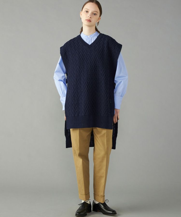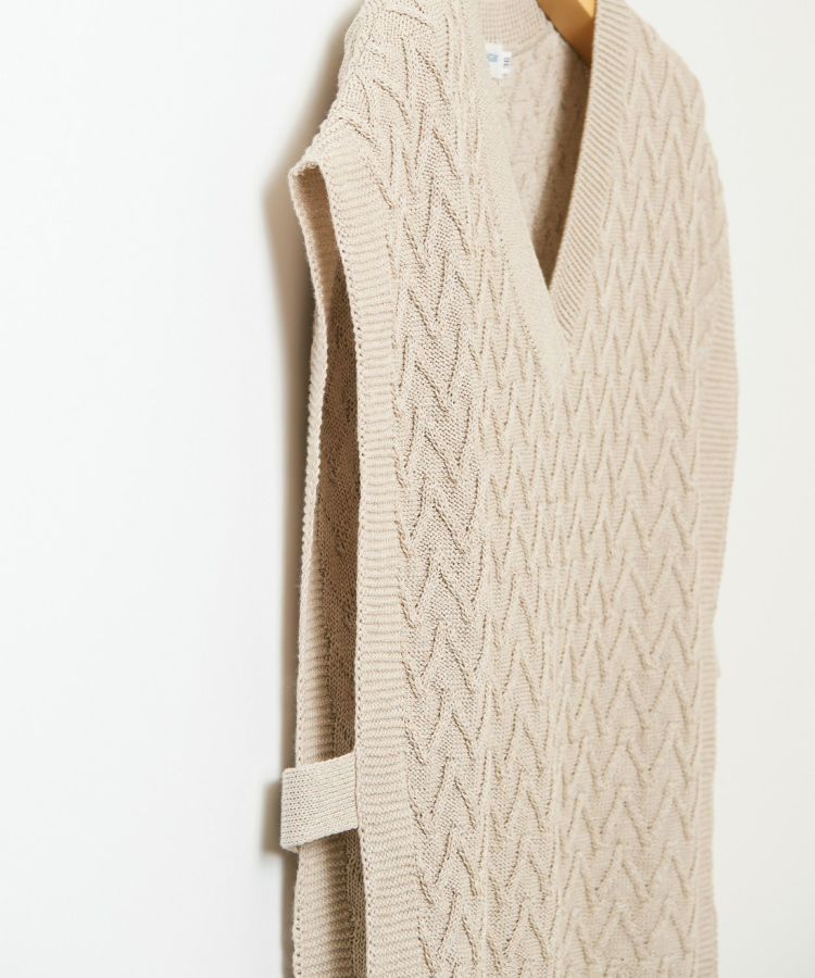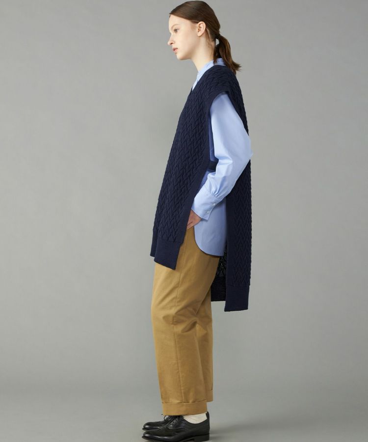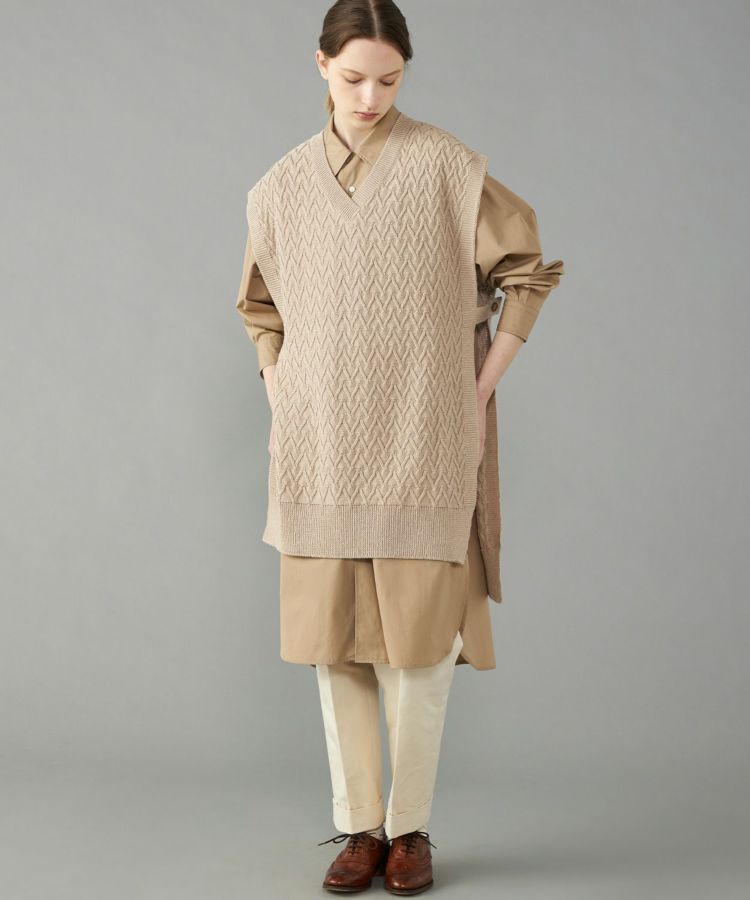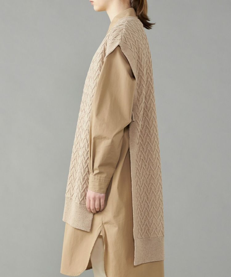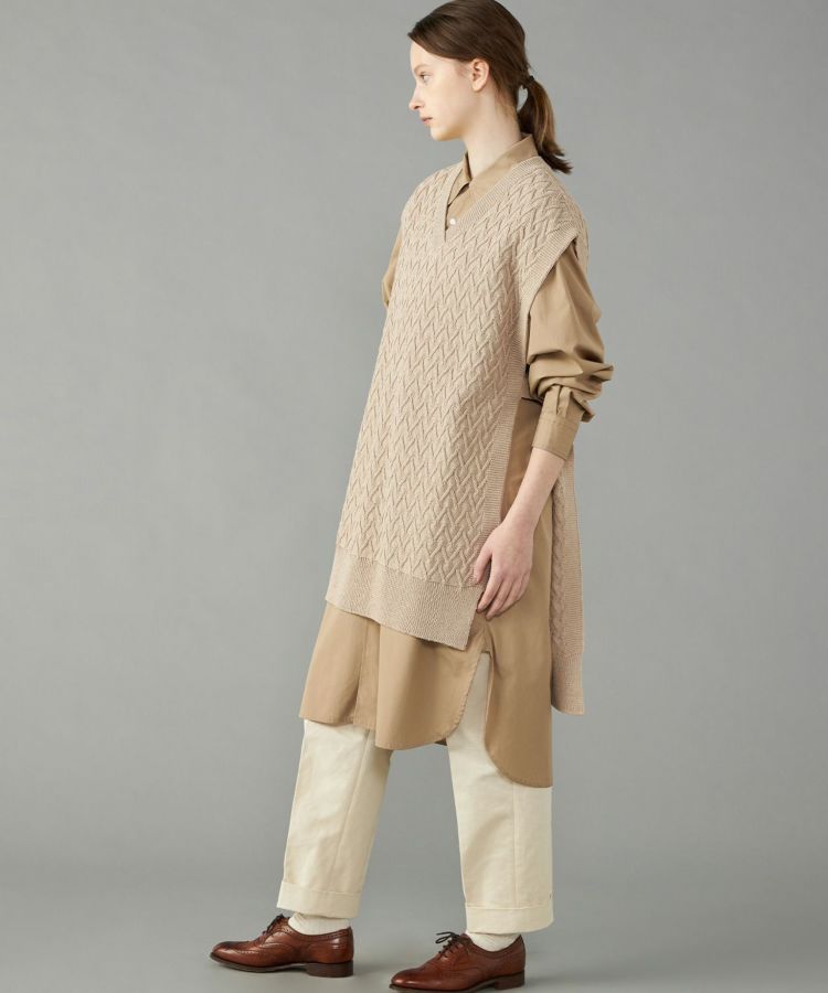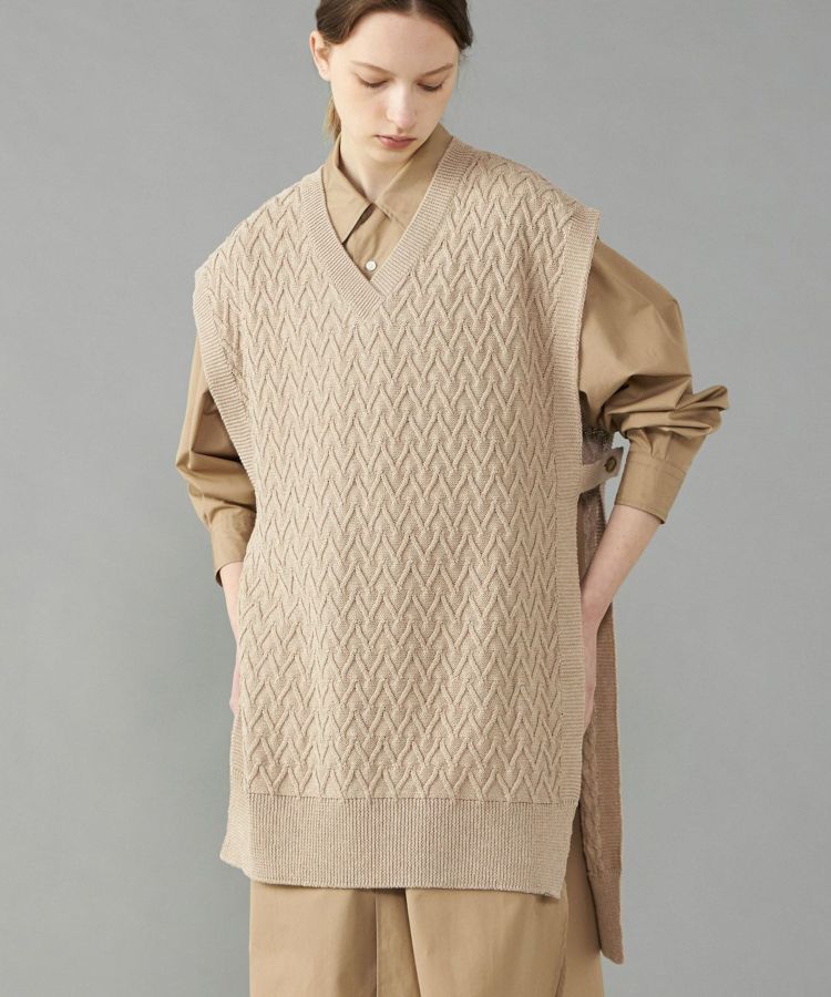 変則タック編みの一種でオリジナルのへリンボーン柄が組まれています。脇はタブ留めのみになっているのでアームにゆとりがあり、シャツやカットソー、ワンピースなどのアイテムとレイヤードし易いデザイン。ロング丈でバランスがとりやすくコーディネートの幅も広がり、長いシーズンで着用いただけます。
