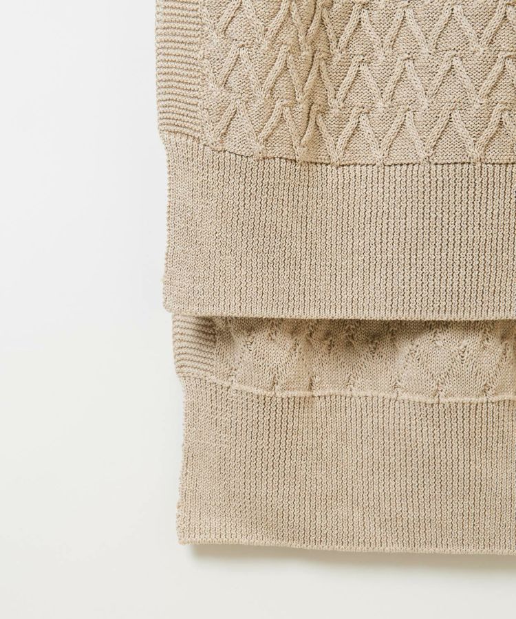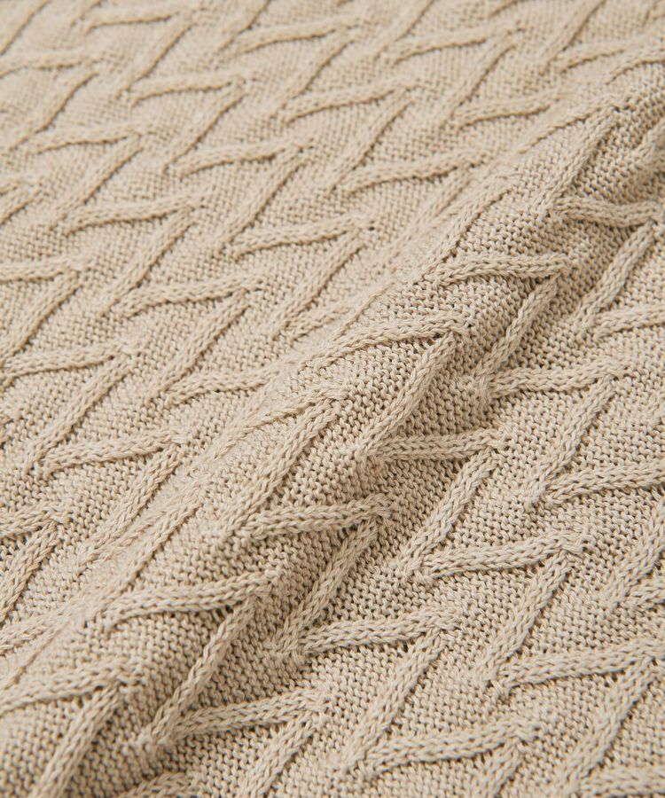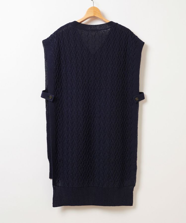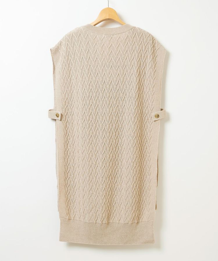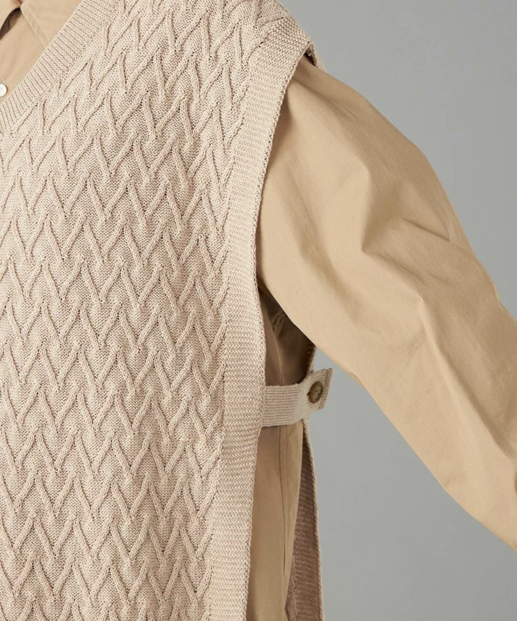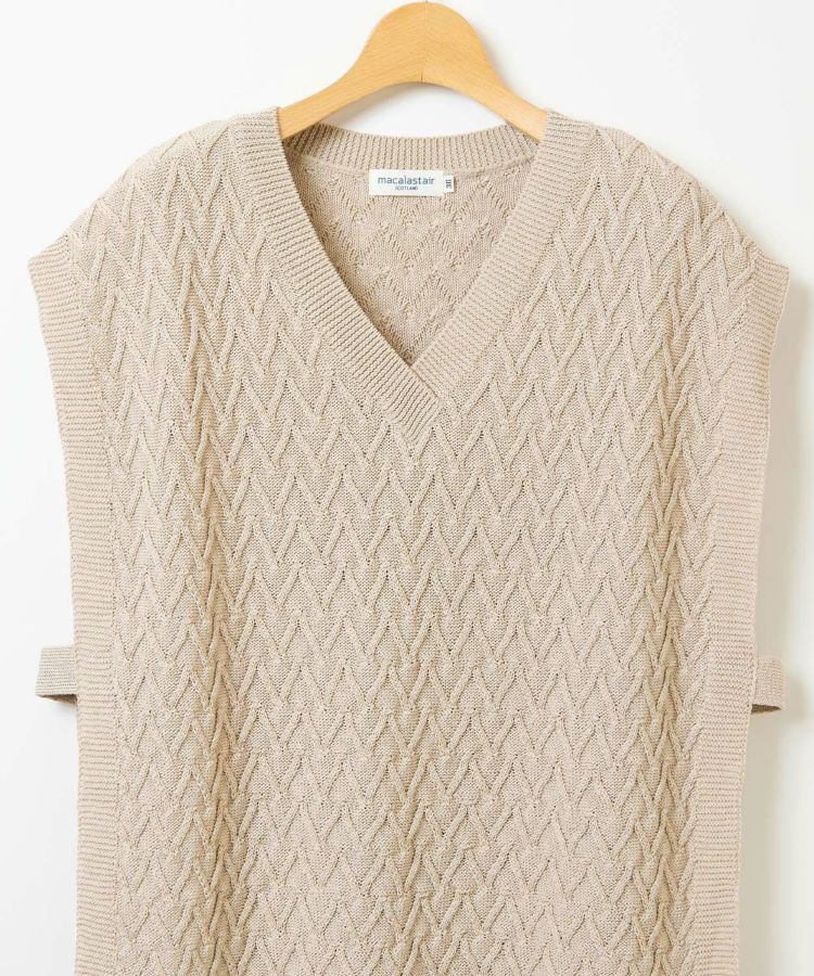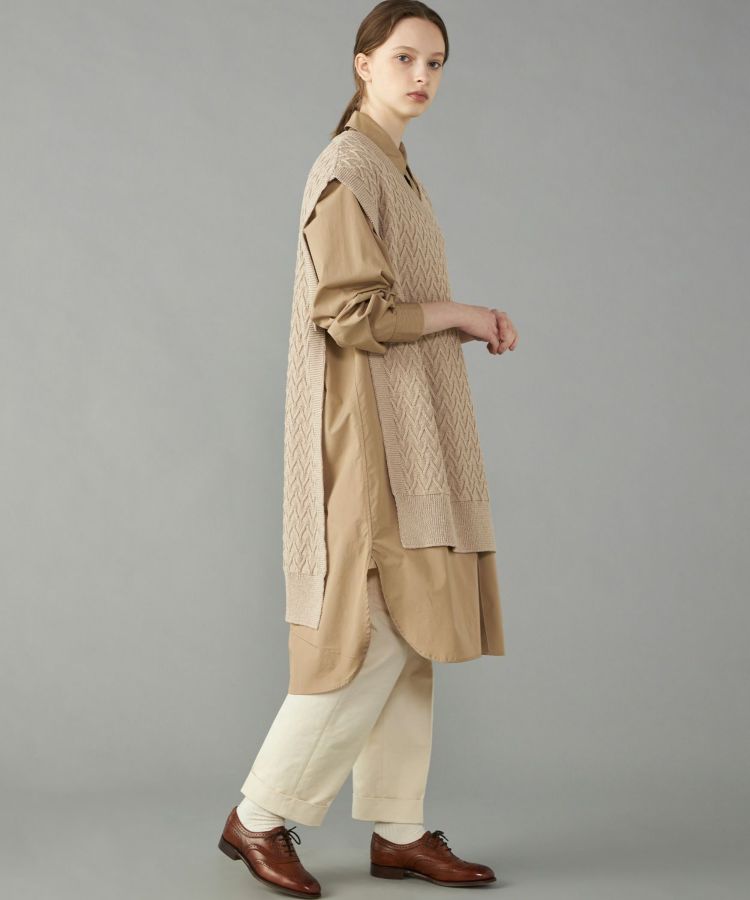 変則タック編みの一種でオリジナルのへリンボーン柄が組まれています。脇はタブ留めのみになっているのでアームにゆとりがあり、シャツやカットソー、ワンピースなどのアイテムとレイヤードし易いデザイン。ロング丈でバランスがとりやすくコーディネートの幅も広がり、長いシーズンで着用いただけます。