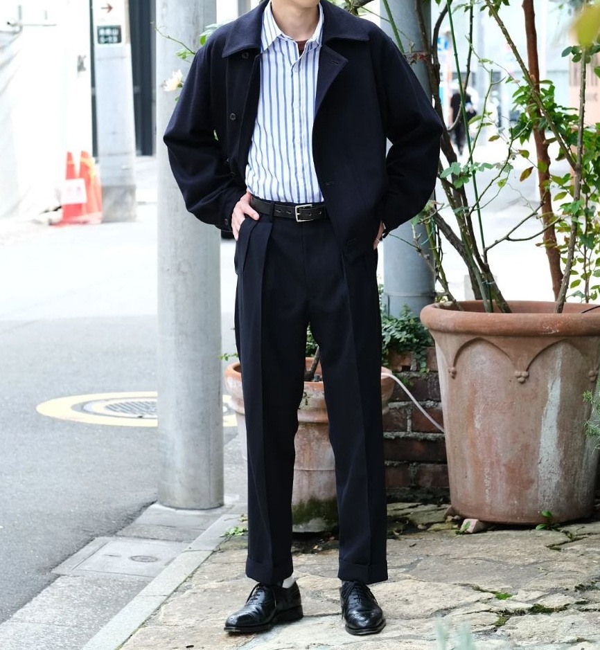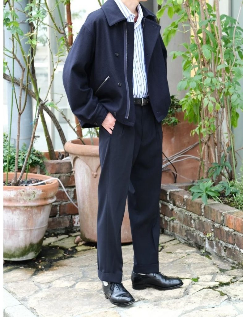 パンツも綺麗なドレープ感と揺れ感がある今回ご紹介のポーツマスを合わせました。ヴィンテージライクのざらっとした質感は、上半身の綺麗なスタイルの生地感のコントラストのアクセントとしても◎