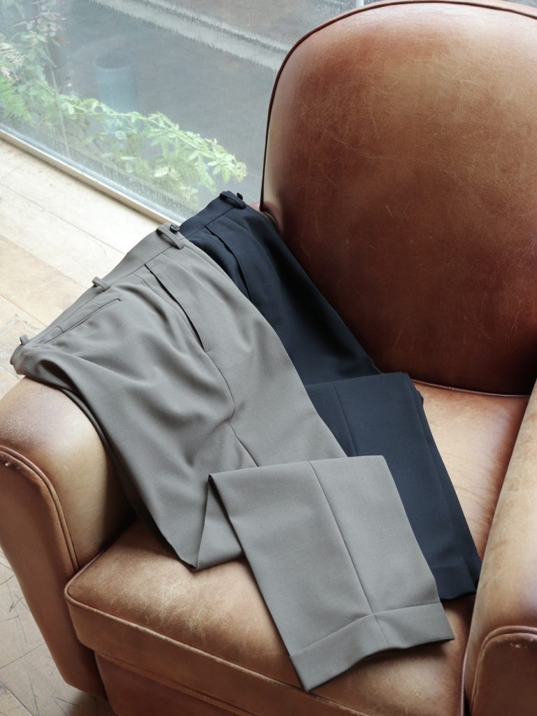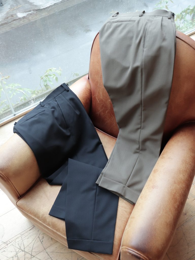 今回の新しい生地はヴィンテージライクな表情のウールにポリエステルを含ませた2者混の生地でご用意。綺麗なドレープが生まれるハリコシの強い生地感であり、公園の散歩から、夜のディナーといった様々なシーンで気兼ねなく履いていただけます。