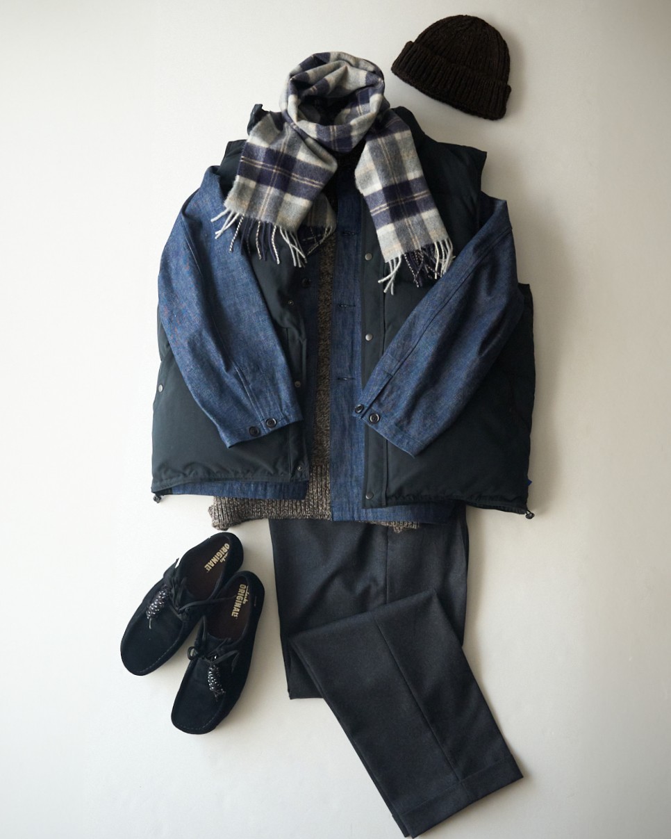 帰省時、見過ごせないのが電車や自動車、飛行機など移動時間のストレス。冬の遠出において、室内と屋外の寒暖調整は欠かせない要素と言えます。そんなこれからの季節には、カバーオールやデニムジャケットといったライトアウターをダウンベストと合わせた着こなしがおすすめです。アウターを脱いで手に持ったり、後部座席に置くときも嵩張らず、身軽なうえに、見た目もどこか新鮮。リラクシングな大人の休日カジュアルにおける理想的な組み合わせと言えるでしょう。