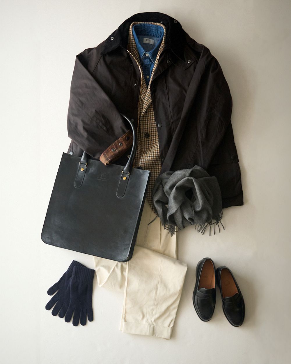 レストランでの会食や初詣、帰省先での挨拶など、いつもより少し背筋を伸ばしたいお出かけには、英国らしいシックな味わいを演出してくれるツイードジャケットがおすすめ。クラシカルなジャケットスタイルに、ネイビーのデニムシャツとオフホワイトのオフィサーパンツを合わせれば、重たくなりがちな冬のトラッドスタイルに軽快で爽やかな印象を添えてくれます。清潔感とさりげない遊び心を両立させた、ウェルドレッサーに相応しい冬のよそ行きスタイルです。
