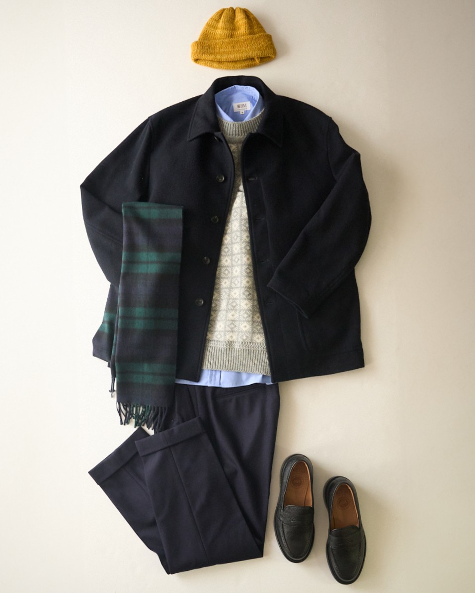 クリーンで誠実、知的な印象の定番カラー、ネイビー。老若男女を問わず好印象を与え、家族行事で選んでも間違いありません。さて、ここではネイビーでアウターとパンツを合わせたセットアップ風の着こなしをご紹介。上下がダークトーンでも重たくならないのは、サックスブルーのシャツと色を利かせた小物たちのお陰です。ブラックウォッチやマスタードイエローのニットキャップは、ネイビー以外のベーシックカラーとも相性抜群で、持っておくとスタイリングの幅が広がります。
