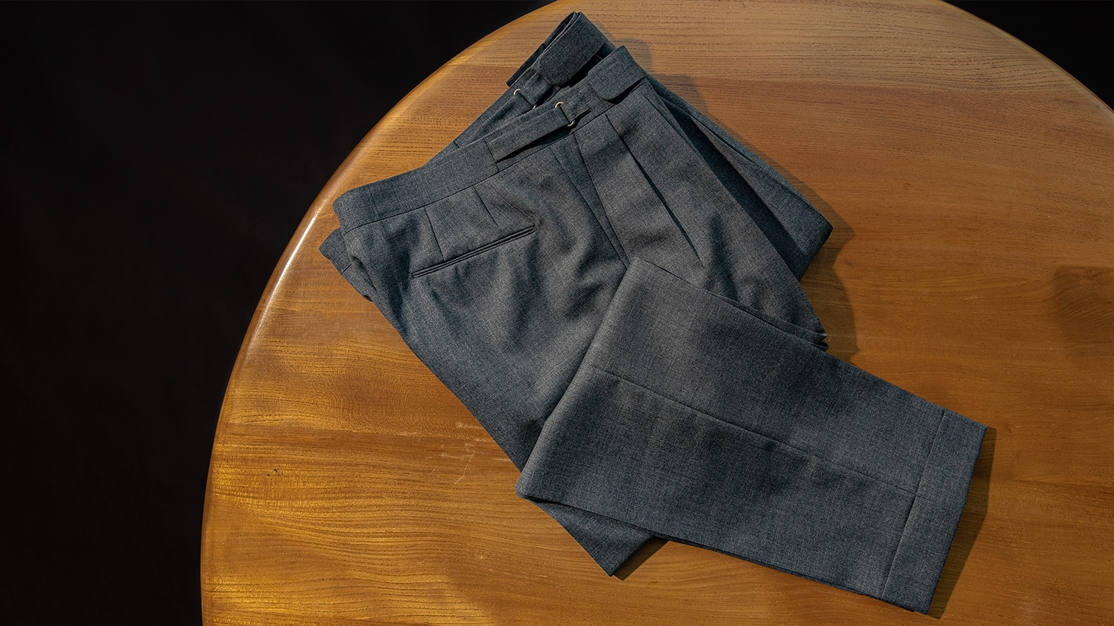 サイドアジャスタータイプに比べ、よりベーシックなベルトループ付きタイプは、オフィス向けのジャケパンから休日スタイルまで、テイストを選びません。一般的なスラックスに比べて腰回りがゆったり作られており、その佇まいは端正ながらもどこかリラクシング。あからさまではない、このひと匙の差が、毎日のスタイリングに絶大な効果を発揮します。春夏にはベルトを効かせた着こなしも楽しめ、一年を通して汎用性高く活躍することでしょう。