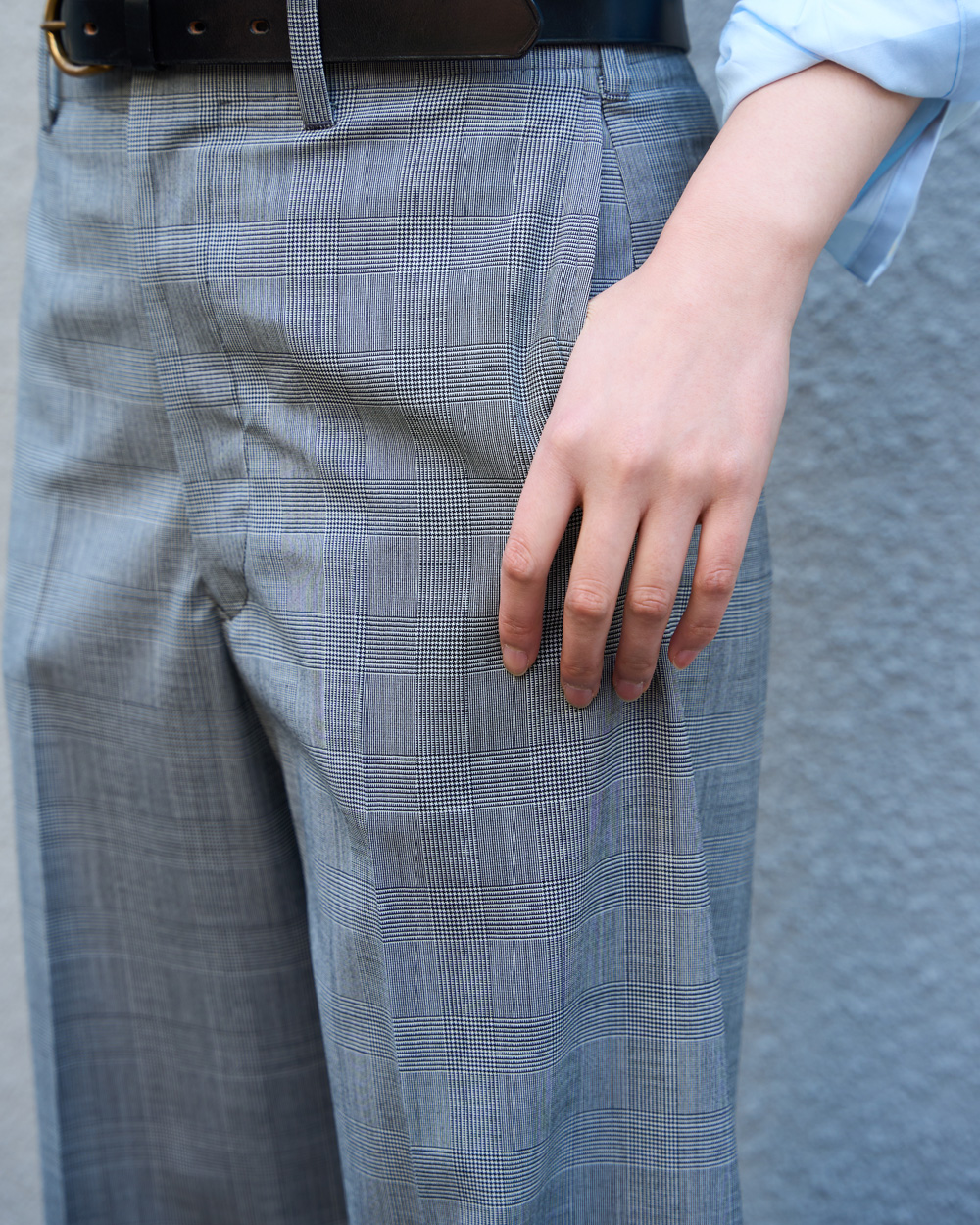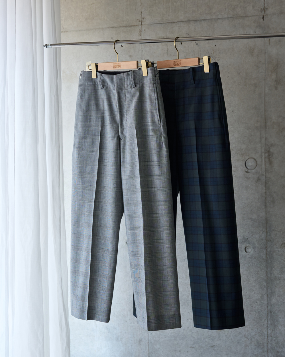セレモニーパンツ 全2色 ¥35,200(BRITISH MADE)ウール混のライトウェイト素材で、春だけでなく一年中活躍するチェックトラウザー。カジュアルにも落とし込める太めのストレートシルエットに、グレンチェックやブラックウォッチというまじめ過ぎない柄が絶妙で、オンオフを問わずシンプルな着こなしを支えてくれます。