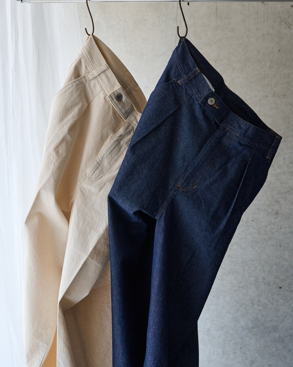 デニムワーキングトラウザーズ 全2色 ¥26,400(BRITISH MADE)岡山県産の10ozデニムで仕立てた新作トラウザーズは、マニッシュな着こなしが叶う股上深めのワンタックシルエットがポイント。程よく力の抜けた佇まいの中に、凛とした上品さもあり、一本で新鮮さももたらしてくれるこの春の大本命です。夏にはサンダルを合わせて、ゆるりと穿くのも◎。
