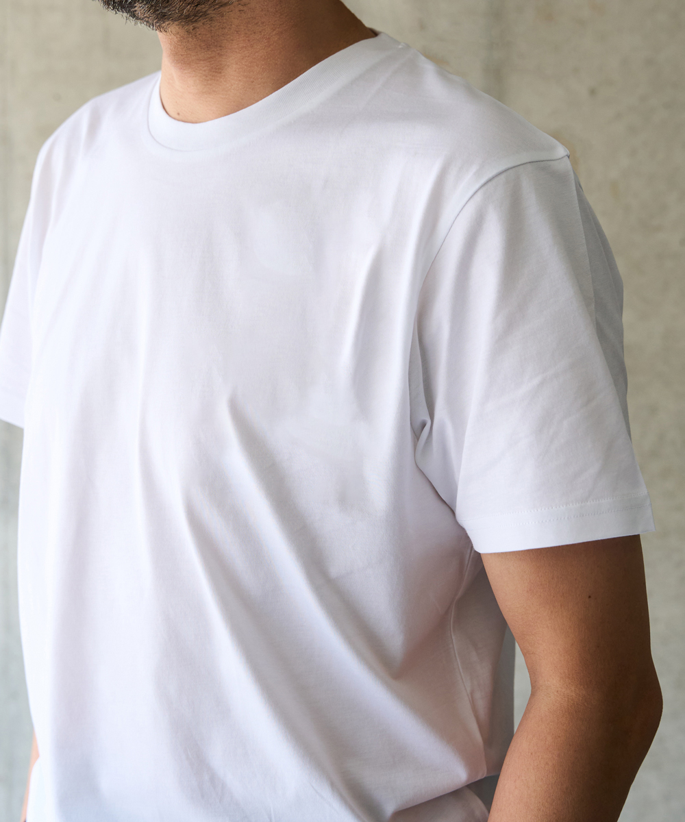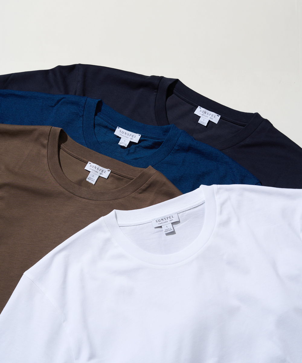トゥルンとした肌触りと、美しい艶。綿100%というイメージを軽やかに覆すこの一枚は、英国の老舗〈サンスペル〉だからこそ成せる技。“Tシャツ界のロールスロイス”とも称された圧倒的な品質は、1860年の創業以来、変わることなく受け継がれています。