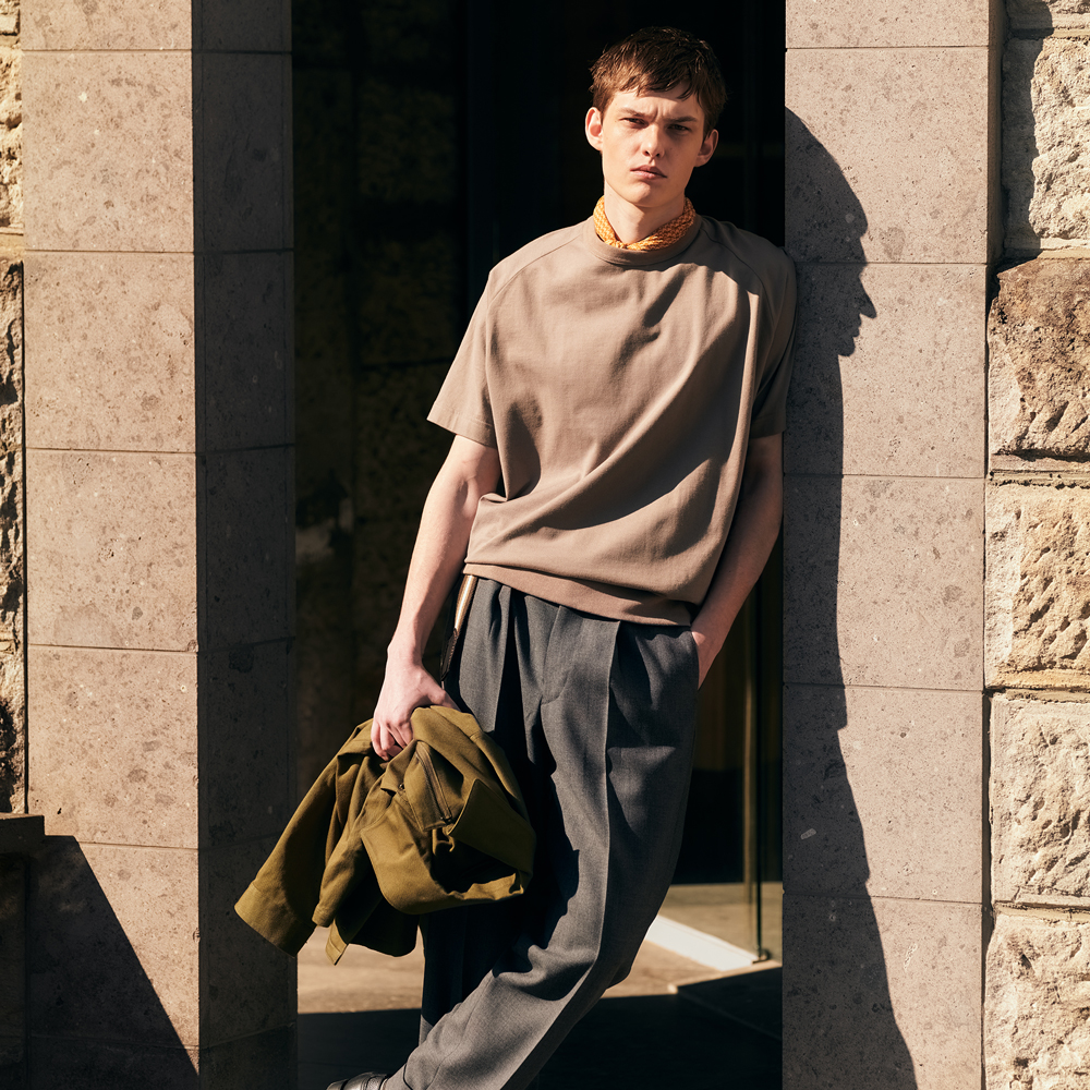 定番トラウザー「オフィサーパンツ」とも相性抜群な本作は、大人の半袖スウェットがテーマ。40番手という繊細な糸のニット地が品を放ち、ドレスとカジュアルを自然に繋ぐ唯一無二のバランスを叶えています。