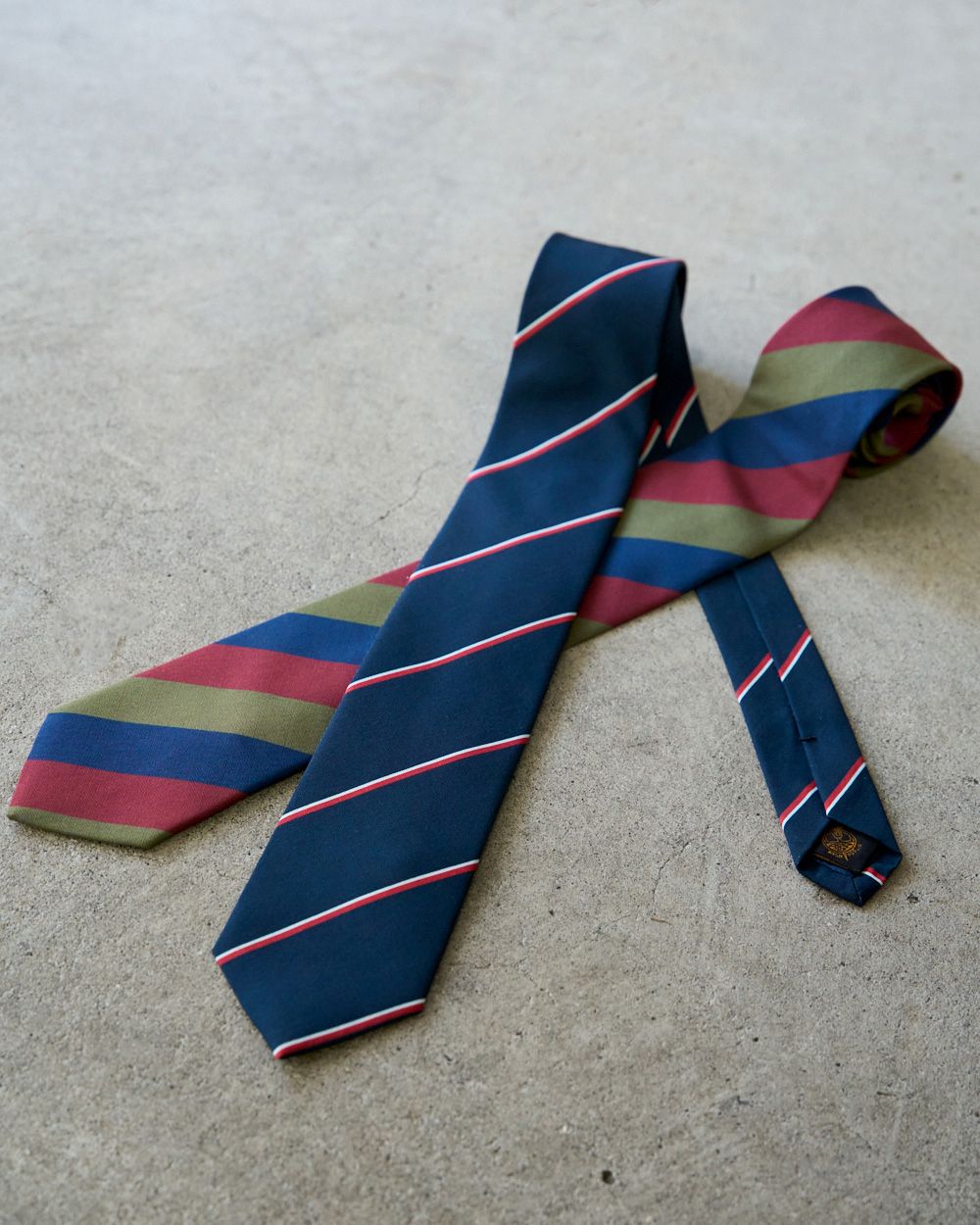 職人によるハンドメイドと、光沢あるアイリッシュポプリンで名高い〈アトキンソン〉のネクタイ。その象徴ともいえるのが、英国軍にルーツを持つ由緒正しきデザイン、レジメンタル(regimental)。特徴は、相手から見て「右肩上がり」のストライプであること。ビジネスシーンやハレの日にも縁起が良く、おすすめです。